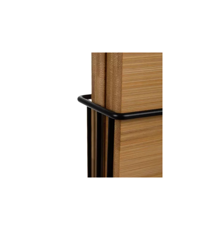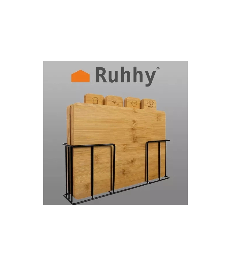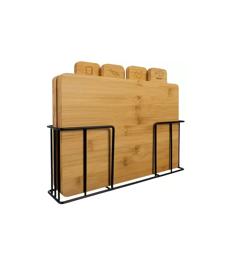 Zestaw desek kuchennych wykonanych z drewna bambusowego o różnym przeznaczeniu dzięki stojakowi zajmuje mało miejsca, a cztery deski będziesz mieć w każdej chwili pod ręką, Każda deska jest oznaczona i przeznaczona do krojenia lub serwowania innych produktów: ryb, mięs, warzyw i owoców oraz pieczywa.