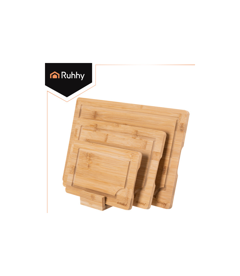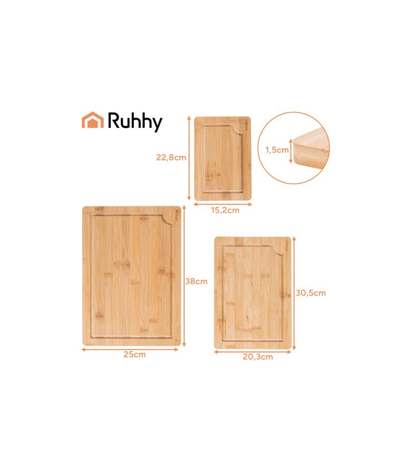 Zestaw trzech desek Ruhhy ułatwia krojenie i organizację w kuchni. Każda deska ma inny rozmiar, dzięki czemu dopasujesz ją do owoców, warzyw, pieczywa lub mięsa. Naturalny bambus jest lekki, solidny i higieniczny, a rowki odprowadzające płyny pomagają utrzymać porządek podczas przygotowywania składników. W komplecie znajduje się stabilny stojak, który pozwala wygodnie przechowywać deski w jednym miejscu, oszczędzając przestrzeń na blacie.