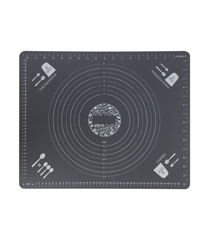 Mata jest wykonana z wysokiej jakości silikonu, ktry doskonale trzyma się podłoża i nie przesuwa się. Gładka powierzchnia maty sprawia, że ciasto nie przywiera. Nadaje się do mycia w zmywarce. Wymiary produktu to 40 x 50 cm. Na stolnicy zaznaczone są specjalne, okrągłe formy ułatwiające przygotowania odpowiedniego rozmiaru wypieku np. pizzy, o średnicy od 15,2 cm/6 cali do 33 cm/13 cali. Powierzchnia maty posiada specjalne pomocnicze przeliczniki gramatury produktw sypkich i płynnych. Na bokach znajdują się dodatkowe miarki – w calach i centymetrach.