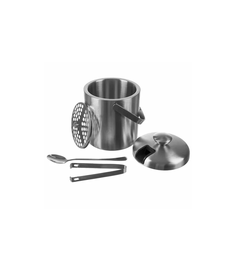 WIADERKO DO LODU + SZCZYPCE + ŁYŻECZKA PODWÓJNA ŚCIANKA TRZYMA CHŁÓD - zestaw wykonany jest z trwałej stali nierdzewnej. Pokrywka i wiaderko mają podwójne ścianki, które dłużej utrzymują lód w stanie zamrożonym. DUŻA POJEMNOŚĆ 1,3l - pojemnik na lód jest idealny do podawania gościom kostek lodu do drinków , ale możesz go również wykorzystać do schłodzenia butelki czy puszki . Pojemność 1,3l pomieści klasyczną butelkę alkoholu. UCHWYT DO PRZENOSZENIA - na bokach wiaderka...