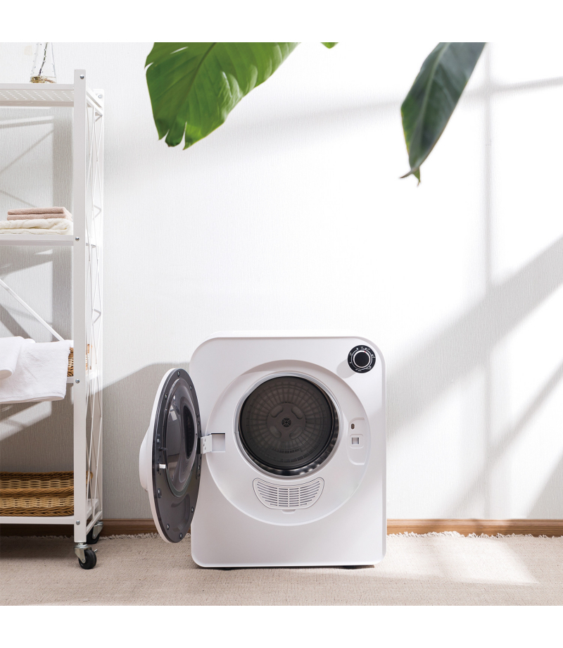 Kompaktowa suszarka bębnowa o pojemności 3kg pozwala na szybkie suszenie ubrań bez względu na warunki pogodowe.