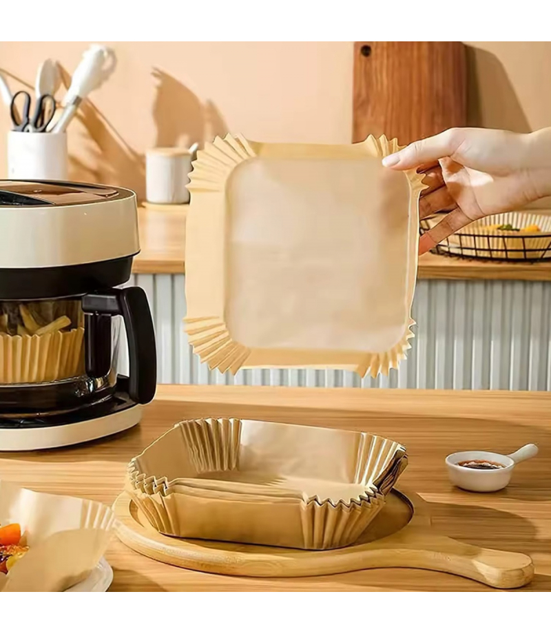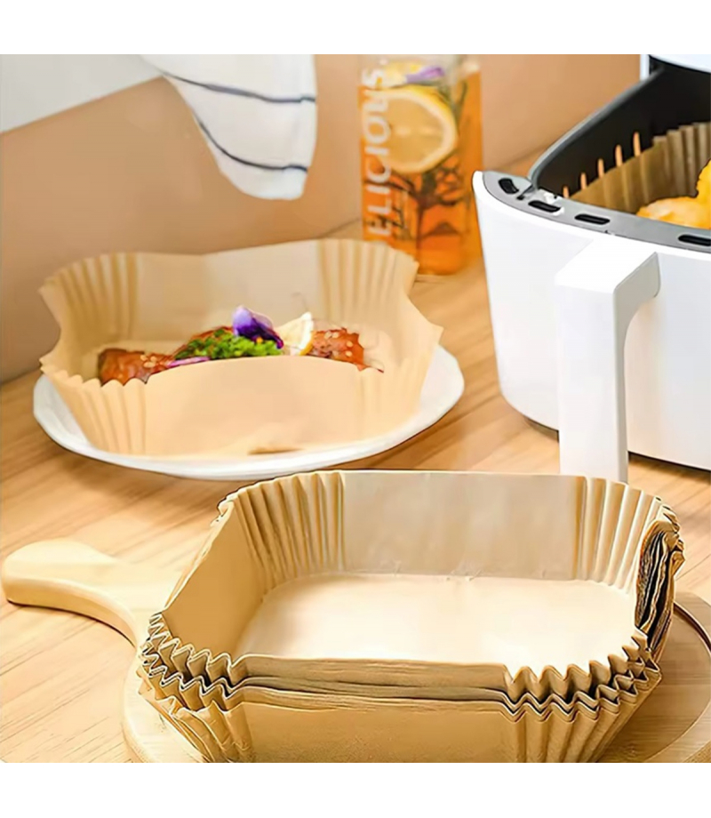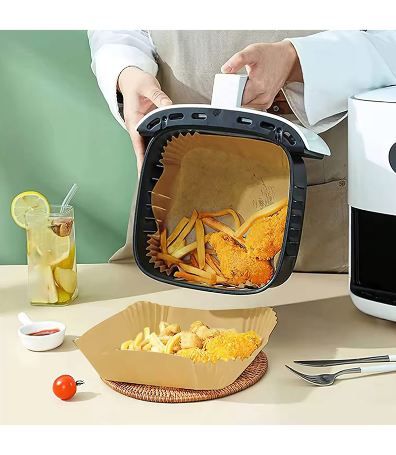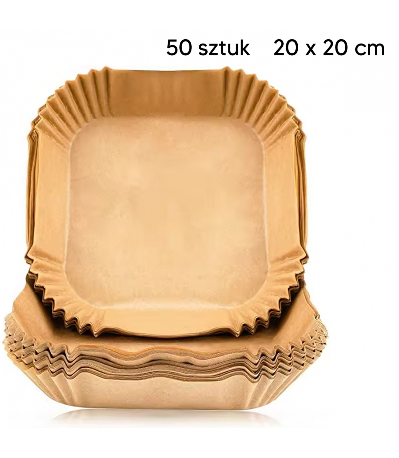 Papier do pieczenia do frytkownicy powietrznej typu air fryer - zestaw 50 sztuk. Produkt umożliwia zachowanie czystości urządzenia. Zapobiega przypalaniu dania podczas smażenia. Wkłady nadają się również do mikrofalówki, piekarnika i innych urządzeń. Papier jest wodo i olejoodporny, dzięki czemu nie przywiera do powierzchni frytkownicy.