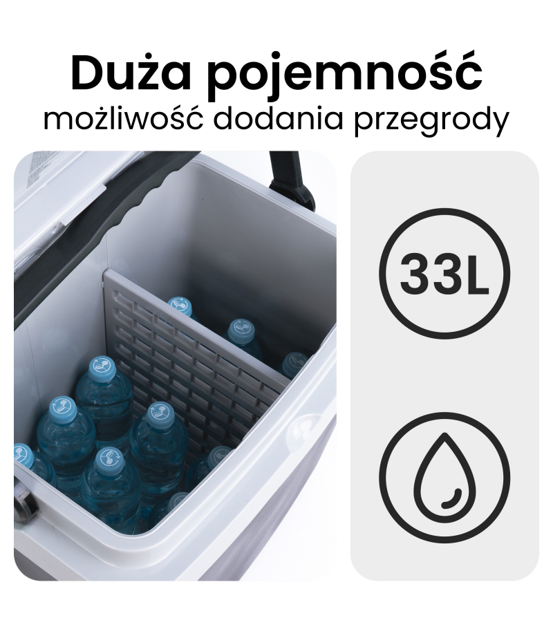 Duża pojemność 33 l – Pomieścisz wszysto, co potrzebne w dużej lodówce turystycznej Huslog o pojemności aż 33 litrów! Lodówka pomieści duże butelki z napojami i jedzenie dla całej rodziny.
