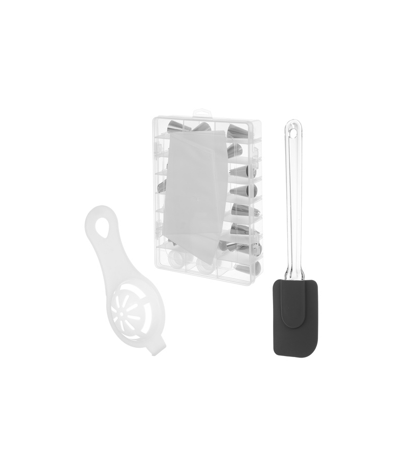 w zestawie: robot planetarny, misa, hak do ciasta, trzepaczka, mikser, pokrywa misy, szpatułka do mas, separator do jajek, rękaw cukierniczy z 24 końcówkami w organizerze, instrukcja obsługi, styropianowe zabezpieczenia na czas transportu, kolorowe opakowanie, brązowy karton transportowy