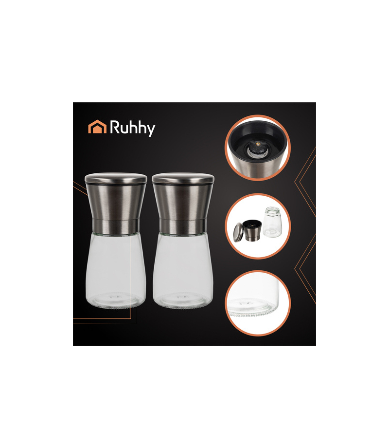 Postaw na styl i funkcjonalność dzięki nowoczesnym młynkom RUHHY. Wykonane z przezroczystego szkła i wykończone metalową pokrywą, pozwalają kontrolować ilość przypraw i jednocześnie prezentują się elegancko w każdej kuchni. Ceramiczny mechanizm mielący zapewnia precyzyjne, ręczne mielenie i pełnię smaku, którą uwolnisz w każdej potrawie. To praktyczny i stylowy zestaw, który doskonale pasuje zarówno do codziennego gotowania, jak i eleganckich aranżacji stołu – bo prawdziwy smak zaczyna się od świeżo mielonych przypraw.