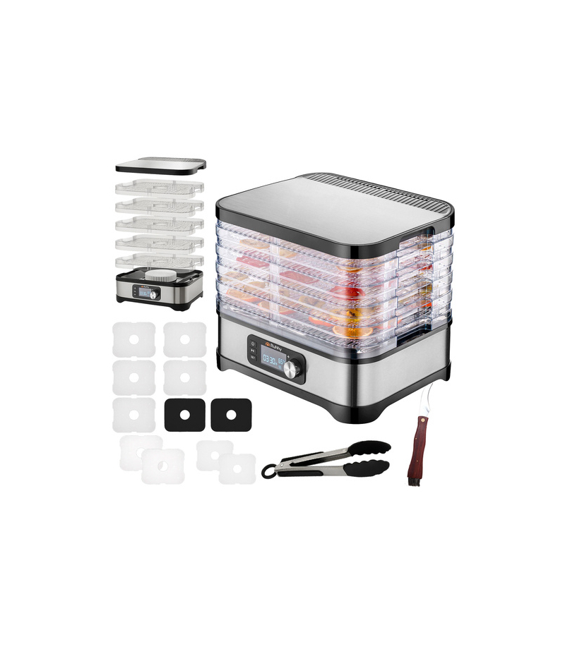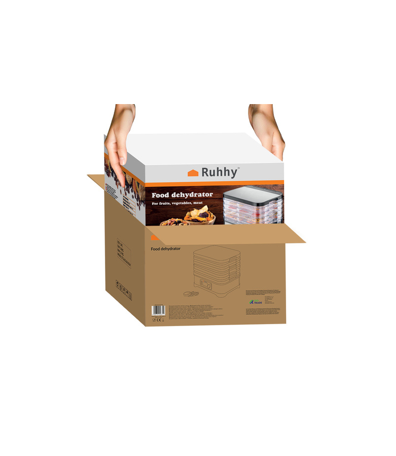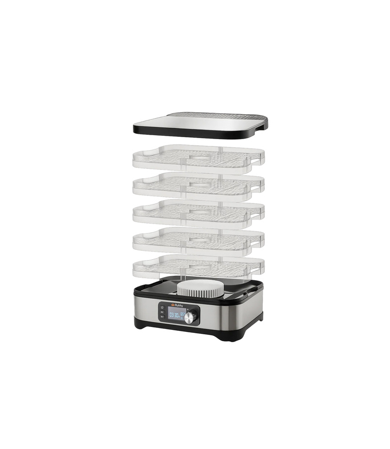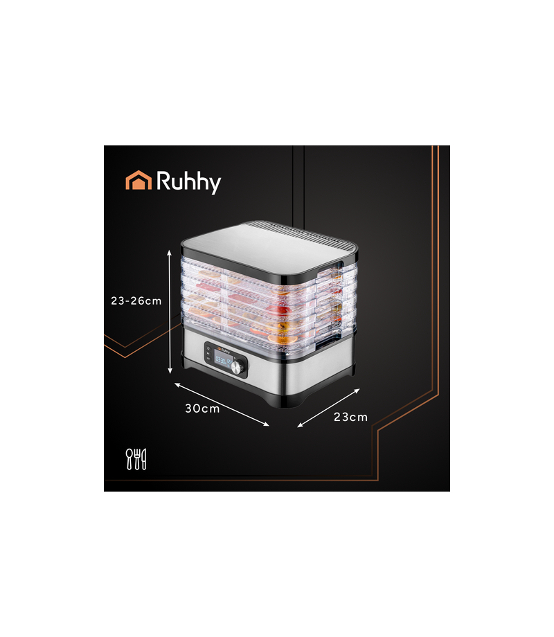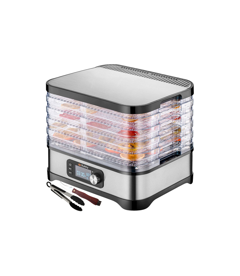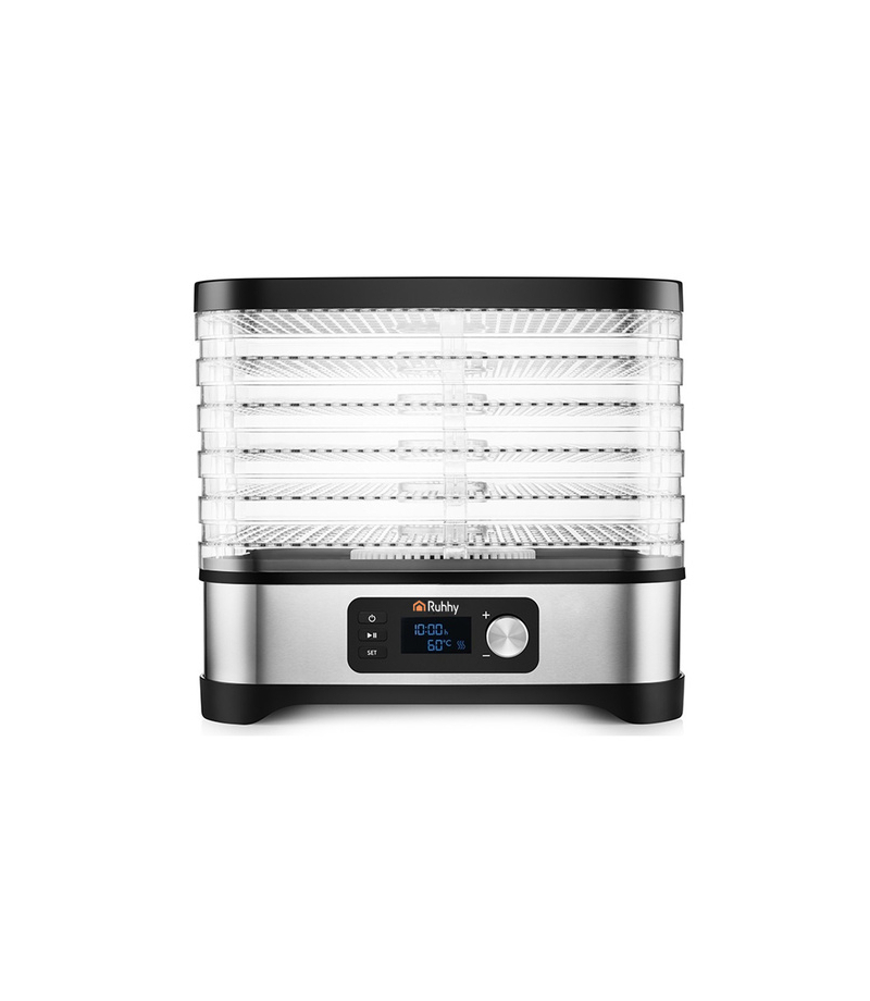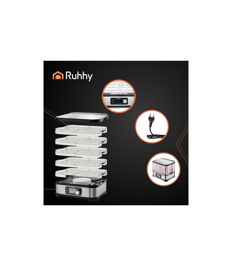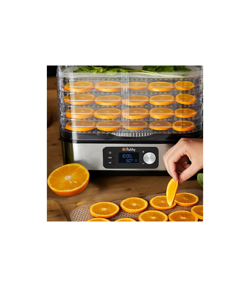 Uniwersalna suszarka RUHHY o mocy 400 W umożliwia suszenie grzybów, owoców, warzyw i ziół – ma aż 5 tacek o łącznej pojemności 10 litrów, regulowaną temperaturę (35–70°C) oraz czytelny wyświetlacz LCD z programatorem do 72 godzin. W zestawie znajdują się również tacki do płynnych produktów, siatki i maty nieprzywierające – dla maksymalnej wygody. Energooszczędna i wykonana z bezpiecznych materiałów BPA FREE – idealna do domowej spiżarni przez cały rok.
