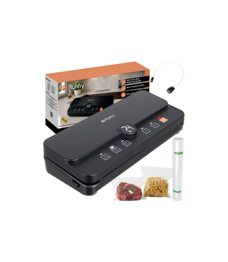 Zgrzewarka próżniowa Ruhhy 80 kPa - szybkie pakowanie i świeżość na dłużej - nożyk przesuwny i schowek na rolkę - 30 cm szerokości worka - 110W - wężyk do pojemników i rolka w zestawie Poznaj urządzenie, które skraca czas pakowania o połowę i pozwala zachować smak potraw nawet 5× dłużej. Wbudowany nożyk przesuwny umożliwia szybkie i równe cięcie folii bez nożyczek, a moc 110 W i siła ssania 80 kPa gwarantują szczelne, profesjonalne zgrzewy jak z restauracji...
