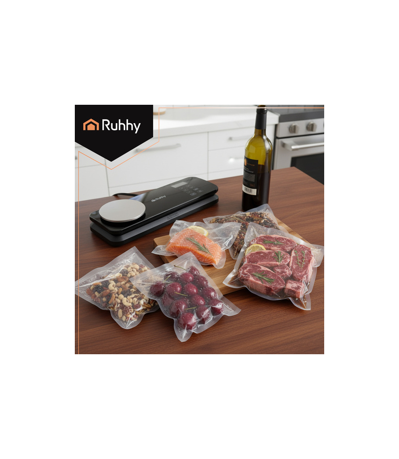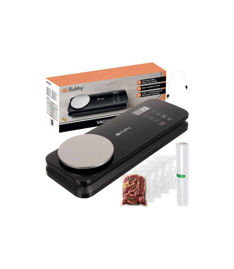 Zgrzewarka próżniowa do żywności Ruhhy 2w1 z wagą- podwójna pompa 80 kPa - nożyk przesuwny - 120W- folie i worki w zestawie Poznaj zgrzewarkę, która nie tylko hermetycznie pakuje żywność, ale też waży ją z dokładnością do 0,1 g , byś zawsze miał pełną kontrolę nad porcjami i świeżością. Dzięki mocy 120 W, podwójnej pompie 9 l/min i sile ssania 80 kPa działa dwa razy szybciej niż standardowe modele, a wbudowany nożyk,...