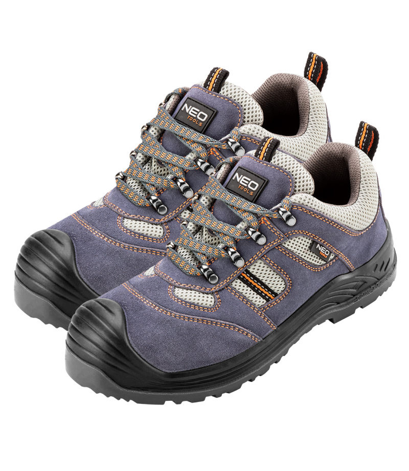 Półbuty robocze, zamszowe, rozmiar 47, CE GTX NEO Tools 82-038 Półbuty robocze, zamszowe, rozmiar 47, antypoślizgowa podeszwa z systemem absorbującym wstrząsy, odporna na ścieranie, oleje, benzynę i inne rozpuszczalniki organiczne, podnosek stalowy wytrzymujący uderzenie do 200J, stalowa wkładka antyprzebiciowa, wkładka antyelektrostatyczna, metalowe szlufki, oddychający materiał, but wykonany w kategorii S1P SRC (SRC- odporność na poślizg na podłożu ceramicznym pokrytym roztworem...