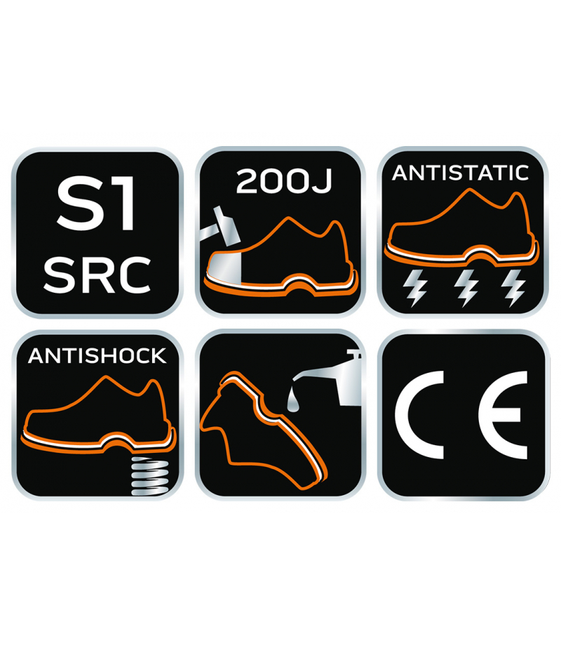 Półbuty robocze, klasa S1 SRC, skórzana cholewka z wytłaczanej dwoiny, metalowe szlufki, podwójne i potrójne szwy, stalowy podnosek zapewniający ochronę przed uderzeniami z energią równą 200J, zabudowana pięta; odporność na oleje, benzynę i inne rozpuszczalniki organiczne; właściwości antyelektrostatyczne; absorbcja energii w części piętowej według klasyfikacji obuwia bezpiecznego wg normy EN ISO 20345, rozmiar 40
