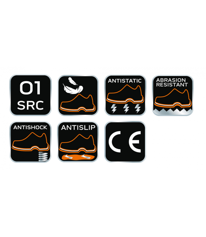 Półbuty zawodowe O1, bez metalu, rozmiar 39, cholewka wykonana z tworzywa, siatkowe wykończenie wewnętrzne, podeszwa wykonana z gumy i pianki EVA wtryskiwana, wkładka antyelektrostatyczna, zabudowana pięta, absorbcja energii w części piętowej, odporność podeszwy na oleje, benzynę i inne rozpuszczalniki organiczne (węglowodory), spełnia wymagania normy EN ISO 20347:2012 SRC FO O1, (SRC- odporność na poślizg na podłożu ceramicznym pokrytym roztworem laurylosiarczanu sodu (SLS) i na podłożu ze stali pokrytym glicerolem), certyfikat CE