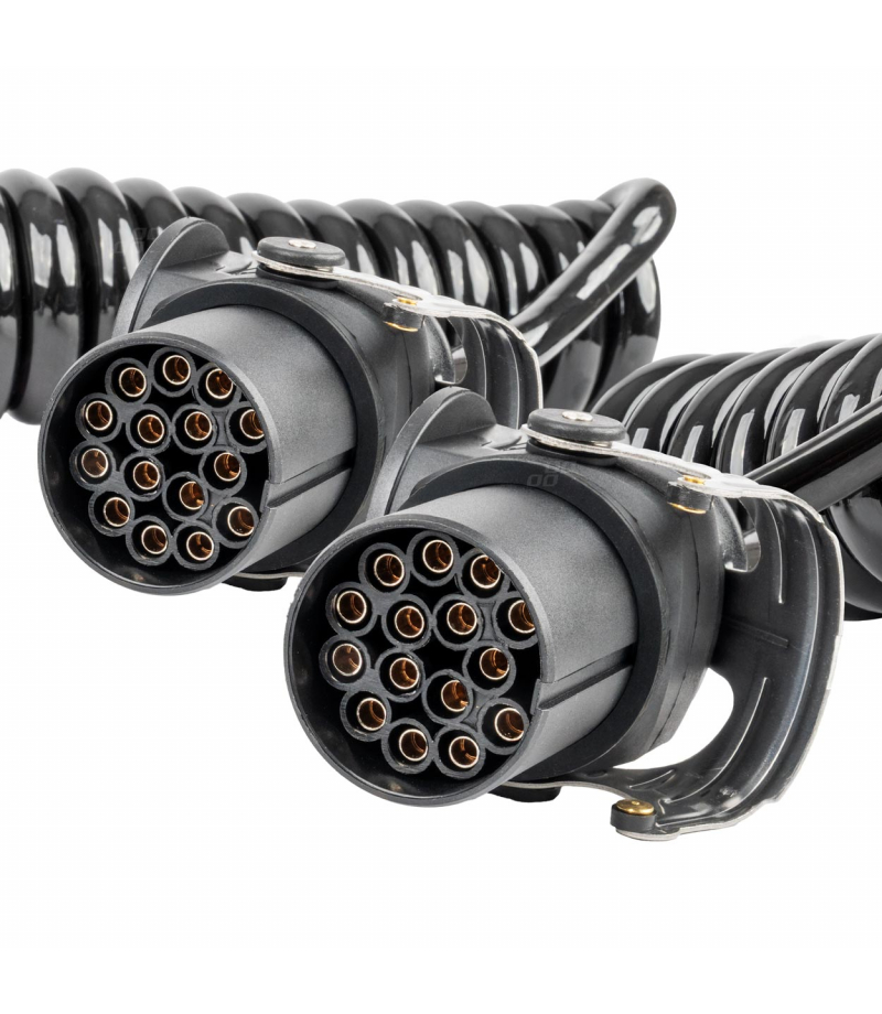 Profesjonalny przewód spiralny do naczepy z dwoma złączami 15 PIN, przeznaczony do instalacji 24V. Zapewnia kompleksowe połączenie elektryczne pomiędzy ciągnikiem a naczepą, umożliwiając przesył sygnałów dla systemów oświetlenia, ABS/EBS oraz dodatkowego wyposażenia zgodnie z normą DIN ISO 12098.