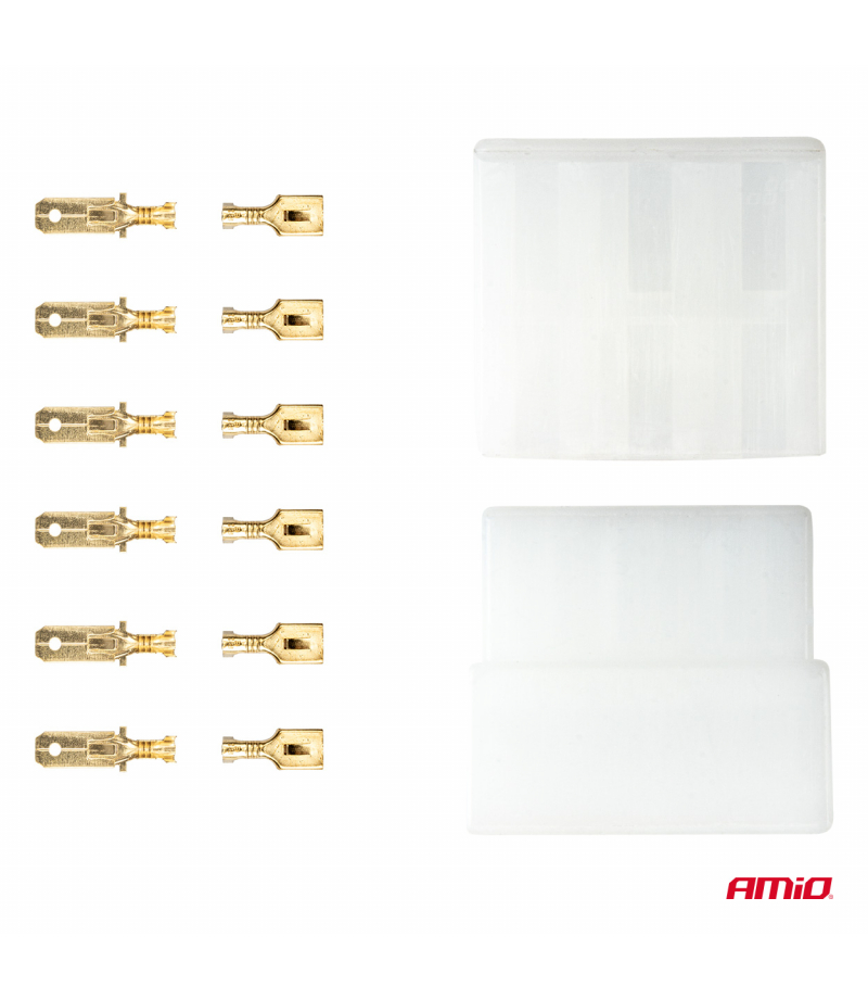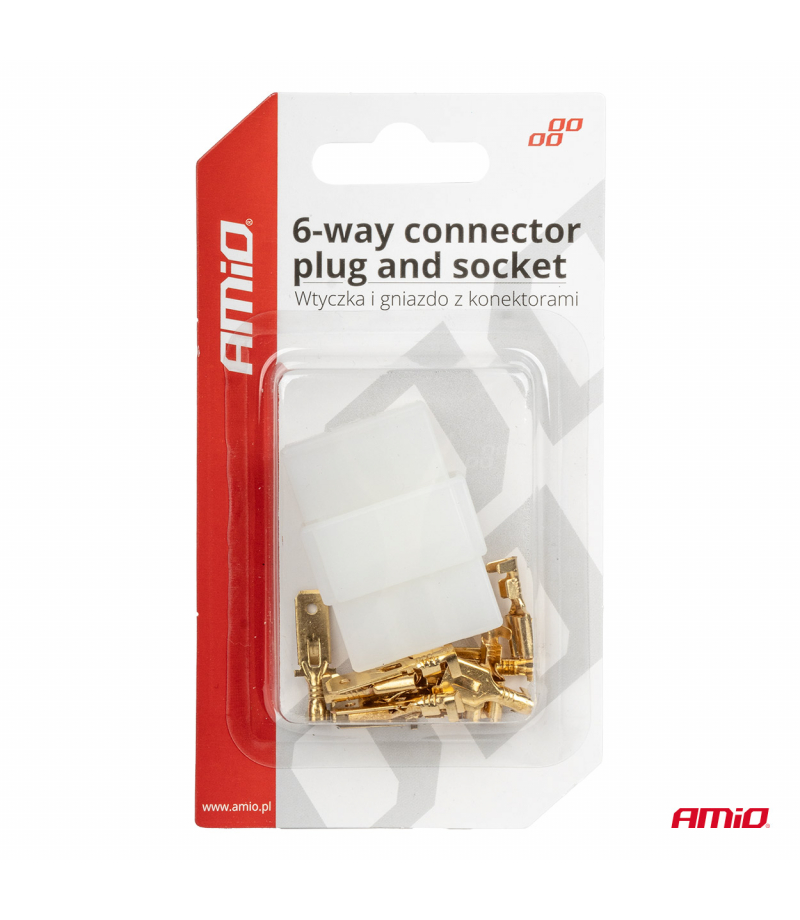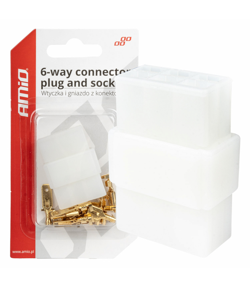 Złącze elektryczne 6 PIN Złączka znajduje zastosowanie w tworzeniu wszelkich połączeń elektrycznych w instalacji samochodu, od których wymagana jest możliwość rozłączania. Można jej także wykorzystać jako element naprawczy w przypadku uszkodzenia lub przecięcia przewodów. W skład zestawu wchodzi: konektor "damski" 6 szt. konektor "męski" 6 szt. osłonki 2 szt. Ilość w opakowaniu [szt.]: 2 Producent: AMiO...