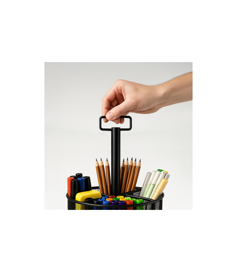- więcej porządku, mniej rozpraszaczy - dzięki łatwemu dostępowi do akcesoriów zwiększasz swoją efektywność i ograniczasz chaos na biurku, obrotowa forma ułatwia szybki wybór narzędzia bez wstawania czy przeszukiwania szuflad