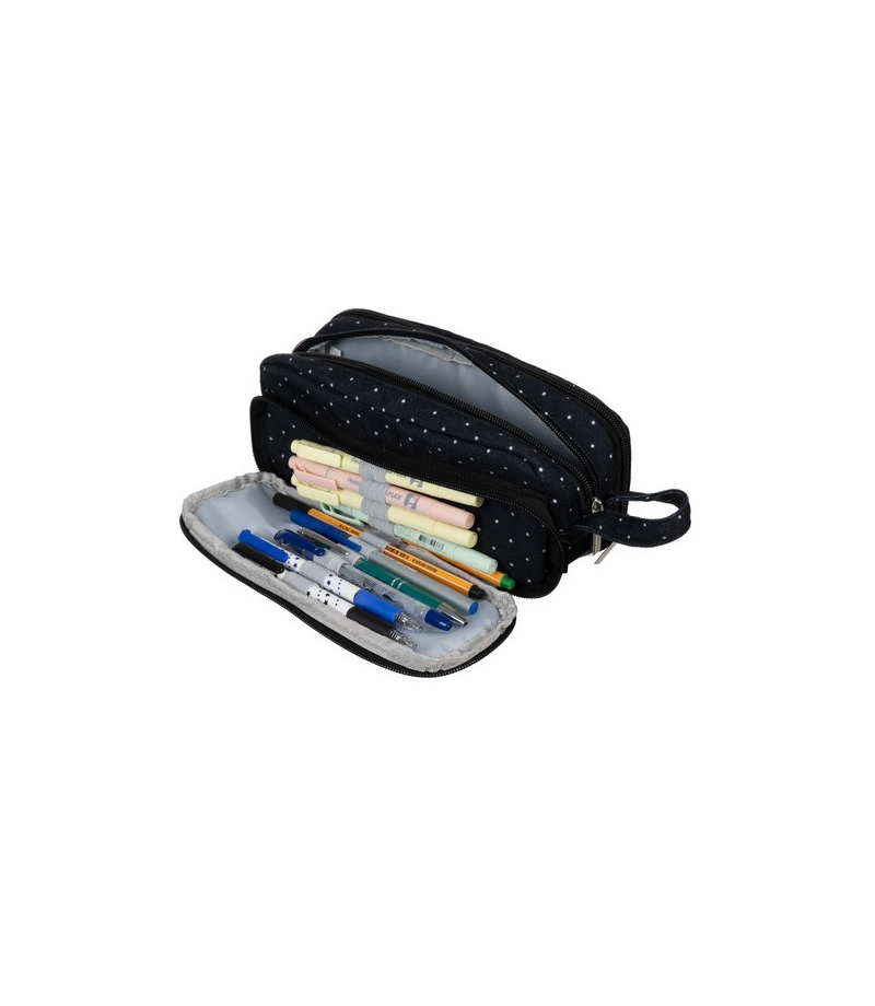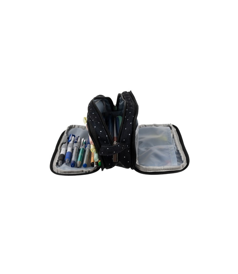 DUŻY CZARNY PIÓRNIK SZKOLNY - ROZKŁADANY / TRZYKOMOROWY POJEMNY PIÓRNIK Z UCHWYTEM I OKIENKIEM - piórnik składa się z 3 części, każda jest zamykana na dwustronne suwaki, co zapewnia wygodny i szybki dostęp do zawartości . Dzięki solidnemu, przyszytemu z boku uchwytowi, piórnik można łatwo przenosić , co jest szczególnie przydatne w codziennym użytkowaniu. Dodatkowe przezroczyste okienko sprawdzi się np. na legitymację szkolną czy studencką, bilet miesięczny albo małą ściągę....