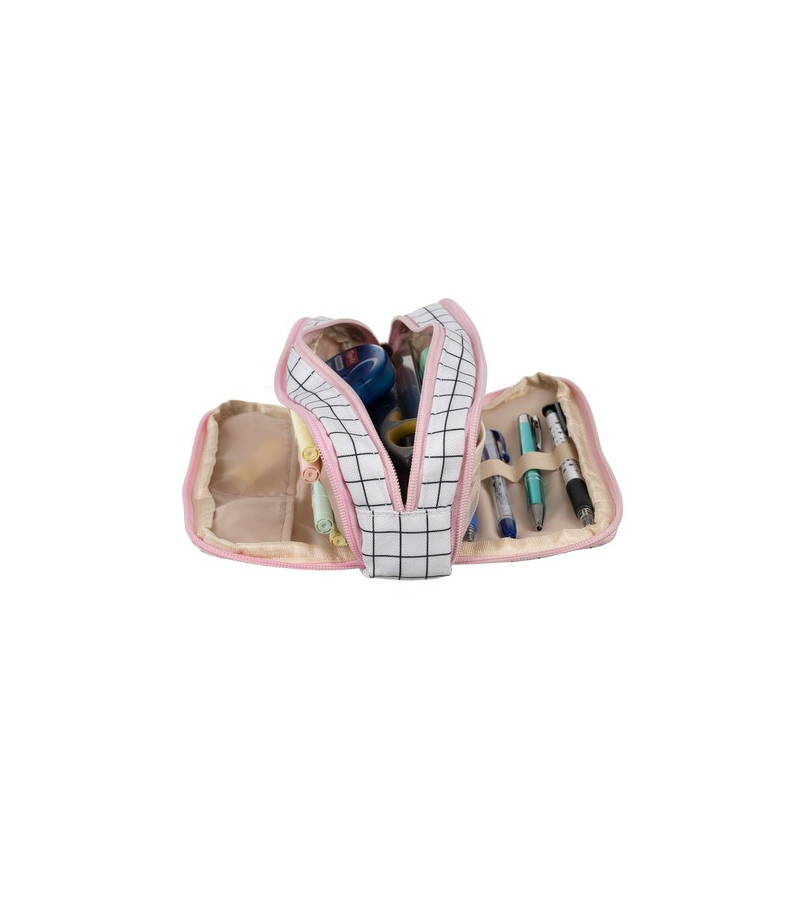 DUŻY PIÓRNIK SZKOLNY W KRATKĘ - ROZKŁADANY / TRZYKOMOROWY W DESIGNERSKIM STYLU - trzykomorowy piórnik wyróżnia się eleganckim wyglądem i nowoczesnym designem. Wykonany z wytrzymałego materiału piórnik zapewnia nie tylko długotrwałe użytkowanie, ale także estetyczny wygląd. Świetnie odzwierciedli osobowość i styl użytkownika. Jego elegancki wygląd, czarna kratka i różowe zamki sprawiają, że sprawdzi się również jako kosmetyczka . POJEMNY I MOCNY PIÓRNIK DLA UCZNIA - piórnik składa...