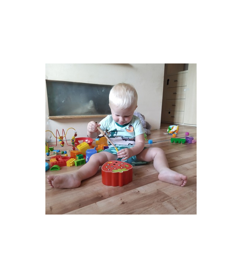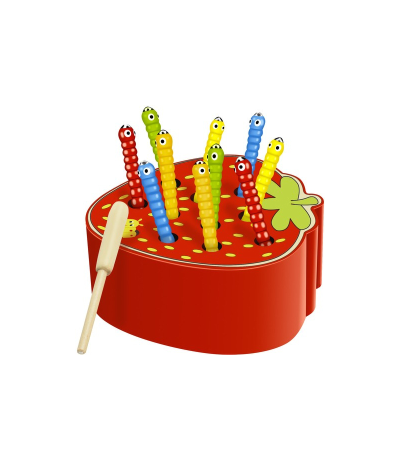 Dziecko najlepiej uczy się poprzez zabawę. Drewniana gra złap robaczka niewątpliwie wzbudzi uśmiech na twarzy dziecka, jak również pomoże rozwinąć m. in. umiejętności motoryczne (ruchowe) oraz wzrokowe. W zestawie znajdują się truskawka, robaczki oraz wędka. Ich oryginalny kształt sprawia, że zabawa jest interesująca.
