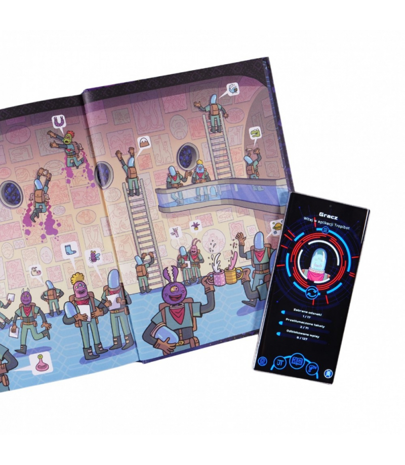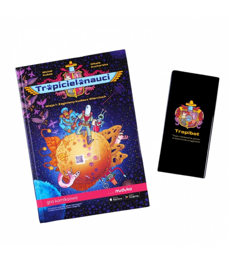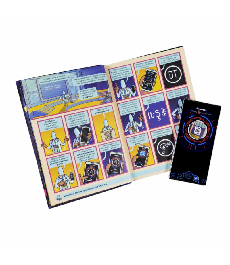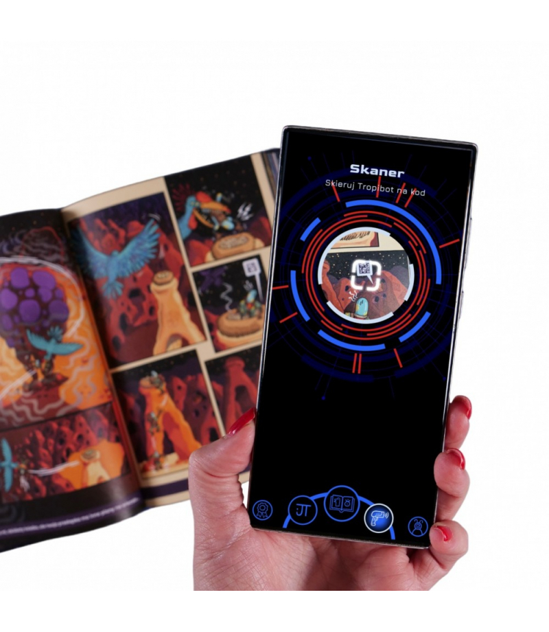 To nie wszystko! Chwyć za telefon, a właściwie Tropibota - telefon z aplikacją Skanuj kody QR z komiksu, tłumacz magiczne znaki (runy), a otrzymasz dostęp do informacji na wagę kosmicznego złota! Poznasz historię planety i jej mieszkańców. Odwiedzisz miejsca, gdzie toczy się życie, takie jak centrum szkoleniowe tropicielonautów, szpital czy mleczarnia. Możesz też zajrzeć do kompendium wiedzy, dzięki czemu twoja misja będzie jeszcze ciekawsza, a Ty unikniesz niebezpieczeństw i podejmiesz lepsze, świadome wybory.