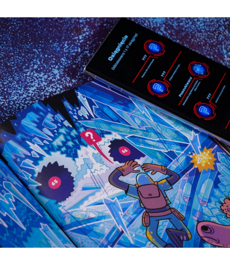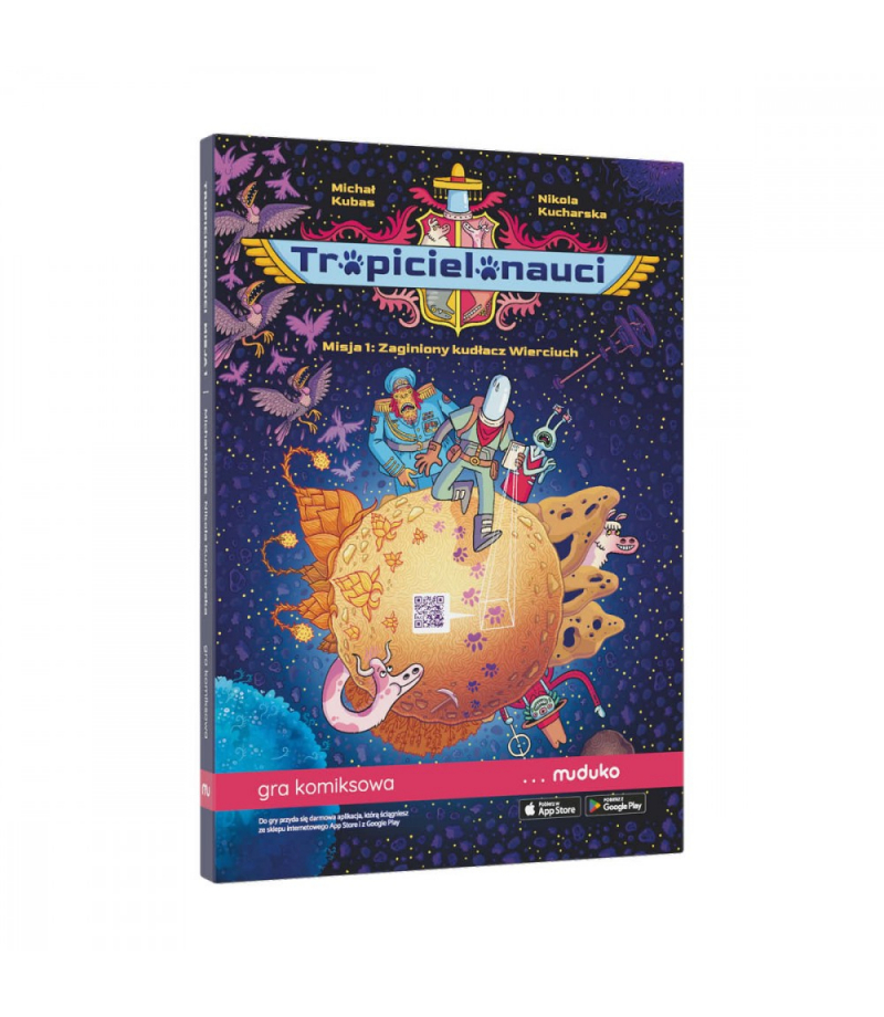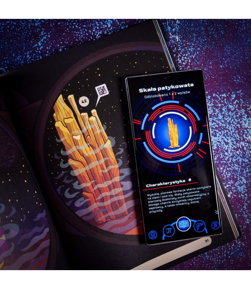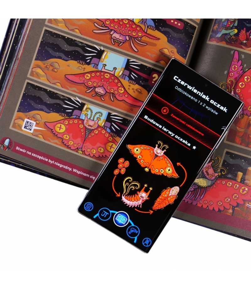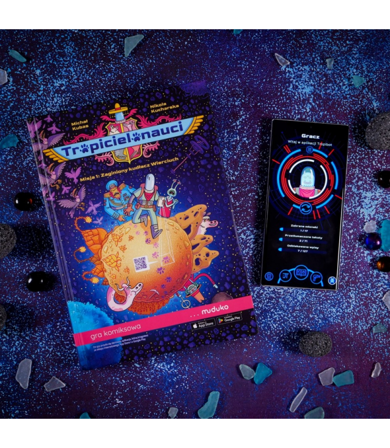 To nie wszystko! Chwyć za telefon, a właściwie Tropibota - telefon z aplikacją Skanuj kody QR z komiksu, tłumacz magiczne znaki (runy), a otrzymasz dostęp do informacji na wagę kosmicznego złota! Poznasz historię planety i jej mieszkańców. Odwiedzisz miejsca, gdzie toczy się życie, takie jak centrum szkoleniowe tropicielonautów, szpital czy mleczarnia. Możesz też zajrzeć do kompendium wiedzy, dzięki czemu twoja misja będzie jeszcze ciekawsza, a Ty unikniesz niebezpieczeństw i podejmiesz lepsze, świadome wybory.
