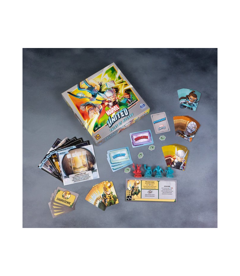 Tales of Asgard to dodatek do Marvel United, kultowej kooperacyjnej gry karcianej Erica Langa (Cthulhu:Death May Die, Bloodborne). Dodatek oferuje trzech kolejnych Bohaterów z komiksowego uniwersum - Thora, Valkyrie i Korga - oraz Łotra - Lokiego. Dzięki sześciu kolejnym Lokacjom gracze przeniosą się do Asgardu, a nowe Wyzwanie Zdrajcy pozwoli wprowadzić rozgrywkę na zupełnie inny poziom, wprowadzając klimat takich gier jak Avalon i konieczność zdemaskowania Zdrajcy w szeregach Bohaterów. Dodatek może zostać rozegrany jako samodzielna przygoda lub w dowolny sposób połączony z podstawką i wszystkimi innymi dodatkami.
