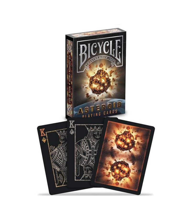 Bicycle Asteroid talię wyróżniają niebywale żywe kolory charakterystyczne dla naszego układ słonecznego. Ponieważ we wszechświecie nie ma dwóch takich samych asteroid to każda karta tej talii Cię zaskoczy, jest unikalna.