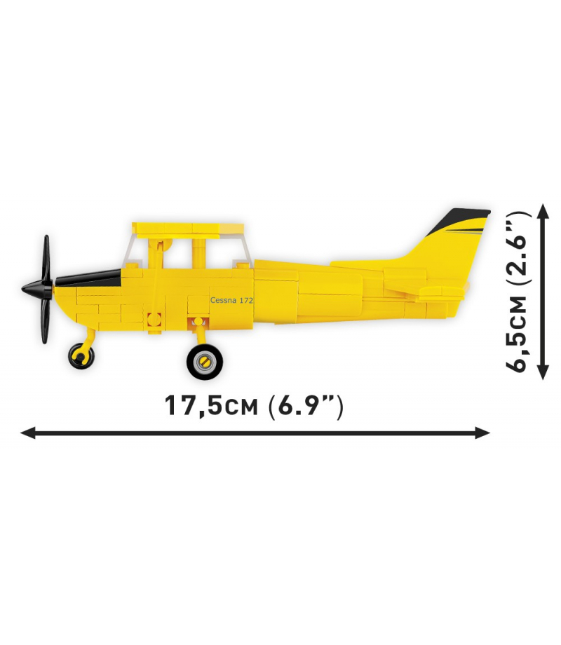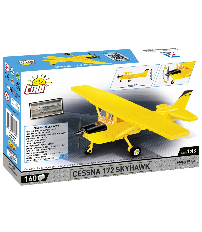 Klockowy model zaprojektowaliśmy z dbałością o detale w skali 1:48 przy użyciu 160 elementów. Swoim rozmiarem doskonale pasuje do kolekcji naszych współczesnych samolotów. Model posiada obracające się koła i ruchome śmigło. Na klockach znajdują się nadruki. Tutaj nie ma naklejek! Specjalnie na potrzeby tego zestawu zaprojektowaliśmy nowy kształt klocka - statecznik pionowy, aby nasz model możliwie realistycznie naśladował swój pierwowzór. Budowa zestawu jest prosta i przebiega bezproblemowo dzięki papierowej czytelnej instrukcji. Klockowa Cessna 172 Skyhawk to model obowiązkowy dla pasjonatów lotnictwa cywilnego. Zabierz swoją pasję do domu i zbuduj to!