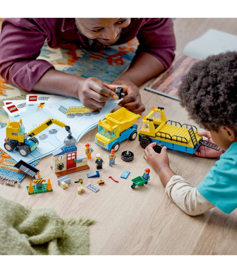 Dzieci uczą się, budując i bawiąc się zestawem LEGO City Ciężarówki i dźwig z kulą wyburzeniową (60391). Ten zestaw konstrukcyjny, zaprojektowany specjalnie dla dzieci w wieku od czterech lat, zawiera trzy pojazdy budowlane, opuszczony dom z funkcją przewracania, trzy minifigurki budowlańców i zabawne akcesoria do pomysłowej zabawy.