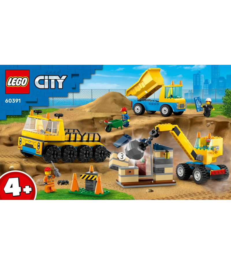 Zabawka konstrukcyjna LEGO City Ciężarówki i dźwig z kulą wyburzeniową 60391; zestaw dla dzieci w wieku od czterech lat; zawiera trzy pojazdy budowlane, opuszczony budynek, trzy minifigurki i akcesoria do zabawy (235 elementów)