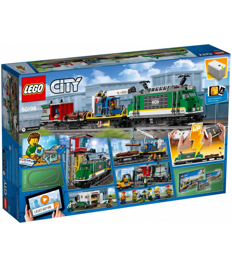 Poprowadź pociąg towarowy przez miasto LEGO City! Załaduj towary na potężny pociąg z zestawu LEGO City 60198 Pociąg towarowy i dostarcz je na czas. Ten ciekawy pojazd z serii LEGO City wyposażony jest w silnik z 10-biegowym pilotem Bluetooth, otwieraną kabinę maszynisty, wagon z obracanym i wysuwanym dźwigiem, wagon towarowy z dwoma kontenerami oraz wagon towarowy na drewno. W zestawie jest także wóz opancerzony z otwieranymi drzwiami oraz wózek widłowy z otwieraną klatką...