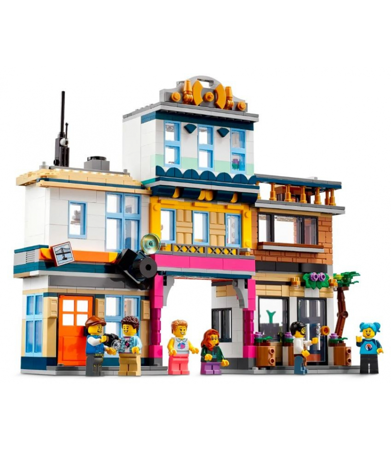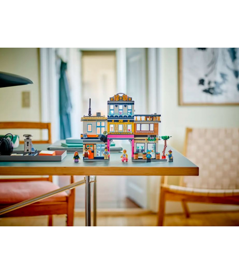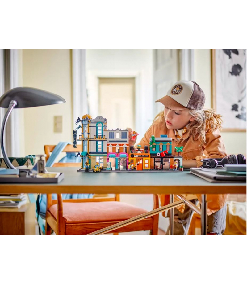 Dzięki zestawowi konstrukcyjnemu LEGO Creator 3 w 1 Główna ulica (31141) wielbiciele LEGO w wieku od dziewięciu lat mogą wybrać się na wycieczkę do miasta. Na miasto składają się cztery różne budynki: trzypiętrowy narożny hotel, sklep muzyczny, sklep z płytami z zespołem na dachu i kawiarnia. Budynki łączą się ze sobą, tworząc scenkę z ulicą, ale można je też rozłączyć i bawić się nimi oddzielnie.