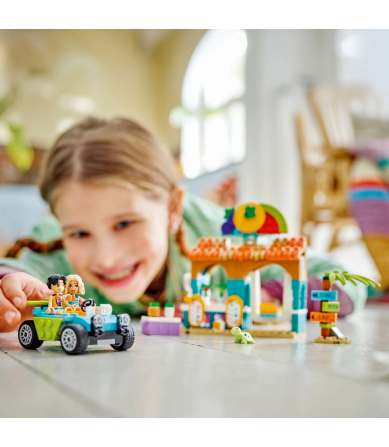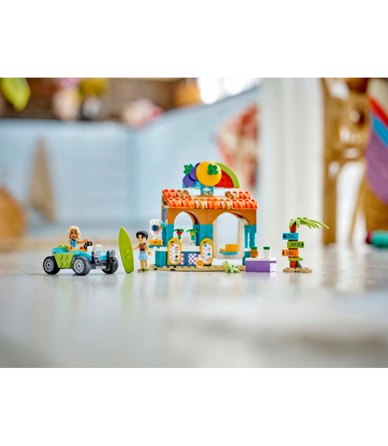 Dzieci mogą tworzyć wiele różnych smaków koktajli, łącząc składniki, a następnie mieszając je w blenderze. Mogą bawić się, że Nova i Niko odpoczywają przy koktajlu na huśtawce, a następnie wyruszają na wycieczkę łazikiem plażowym. Ten zestaw konstrukcyjny LEGO zawiera mnóstwo akcesoriów pobudzających wyobraźnię, w tym menu, deskę surfingową, kamizelkę ratunkową, wideorejestrator i drogowskaz.