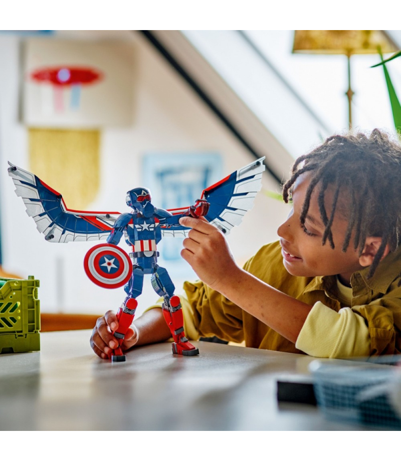 Figurka superbohatera do zbudowania ma 28 cm wysokości i ruchome ramiona, ręce, biodra i nogi, dzięki czemu dzieci mogą ustawiać ją w realistycznych pozach podczas pomysłowego odgrywania ról. Do pleców figurki przymocowane są duże, foliowe skrzydła, które można zginać, aby udawać, że postać nimi macha. Po powrocie na ziemię można je też z łatwością odczepić. Figurka Kapitana Ameryki ma swoją kultową tarczę, a na jej plecach jest przyczepiony dron Redwing do zbudowania, który dzieci mogą odczepić i bawić się nim oddzielnie. Dodatkową cyfrową zabawę zapewni intuicyjna aplikacja LEGO Builder, w której konstruktorzy mogą powiększać i obracać zestawy w 3D oraz śledzić swoje postępy.