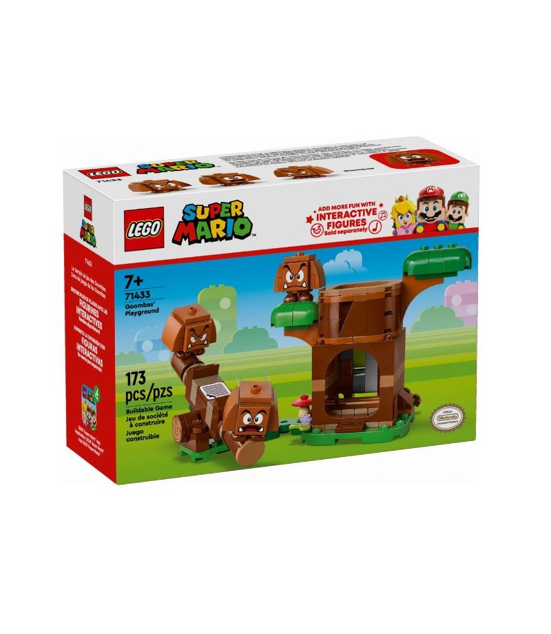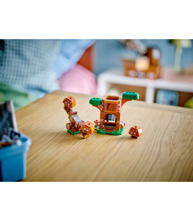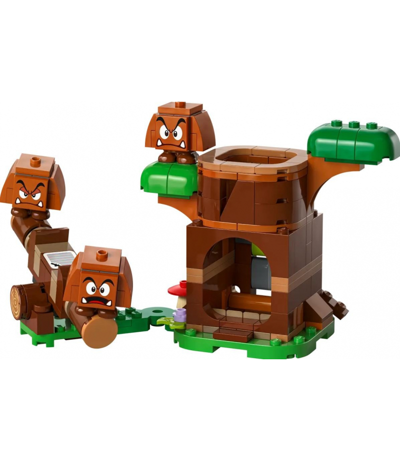 Odgrywaj role i nie tylko podczas zabawy zestawem LEGO Super Mario Goomba i plac zabaw (71433). To świetny prezent na każdą okazję dla chłopców, dziewczynek i wszystkich fanów Super Mario w wieku od siedmiu lat. Ten model kolekcjonerski Nintendo zawiera trzy figurki Goombów, pień drzewa do zbudowania i huśtawkę do twórczej zabawy. Naciśnij dźwignię z tyłu pnia drzewa, aby wyskoczył z niego Goomba. Następnie możesz bawić się z Goombami na huśtawce lub ustawić ich na sobie, aby zbudować goombową wieżę.