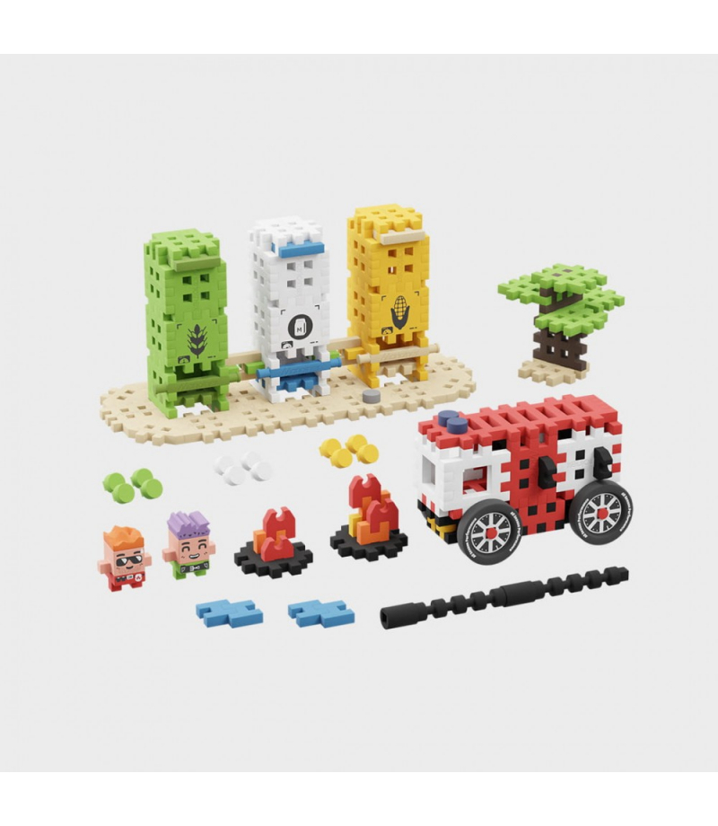 Zadbaj o bezpieczeństwo pracowników magazynu żywności i nie pozwól, by cenne surowce poszły z dymem. Zestaw Akcja Strażacka składa się ze 148 elementów i aż dwóch wyjątkowych figurek. Wciel się w rolę bohaterskiego strażaka Marka, zbuduj wóz strażacki z wężem gaśniczym i uratuj silosy rolnika Luciana. W zestawie znajdziesz także trzy silosy, które magazynują żywność, drzewo i klocki imitujące niebezpieczne płomienie.