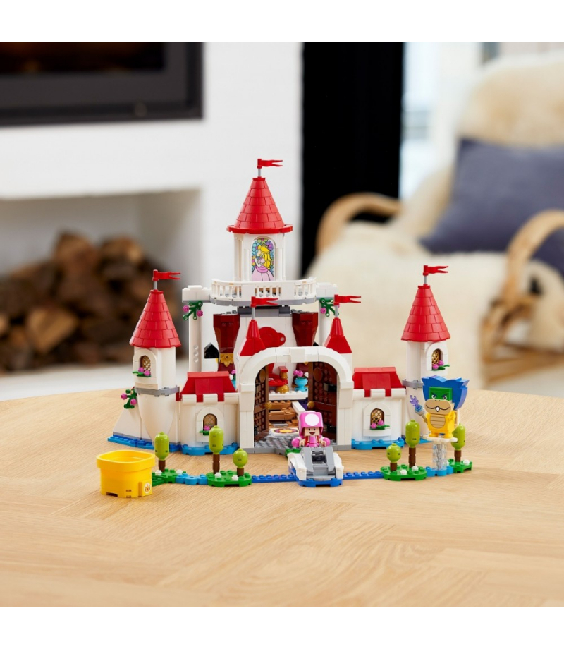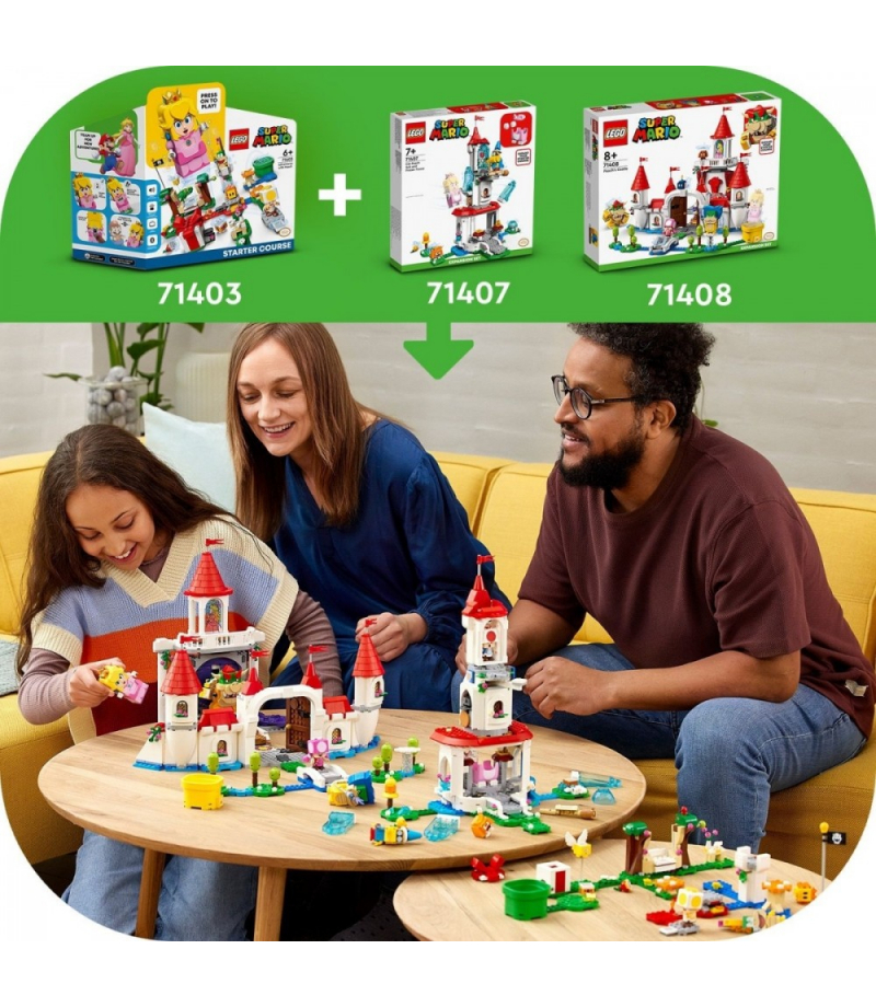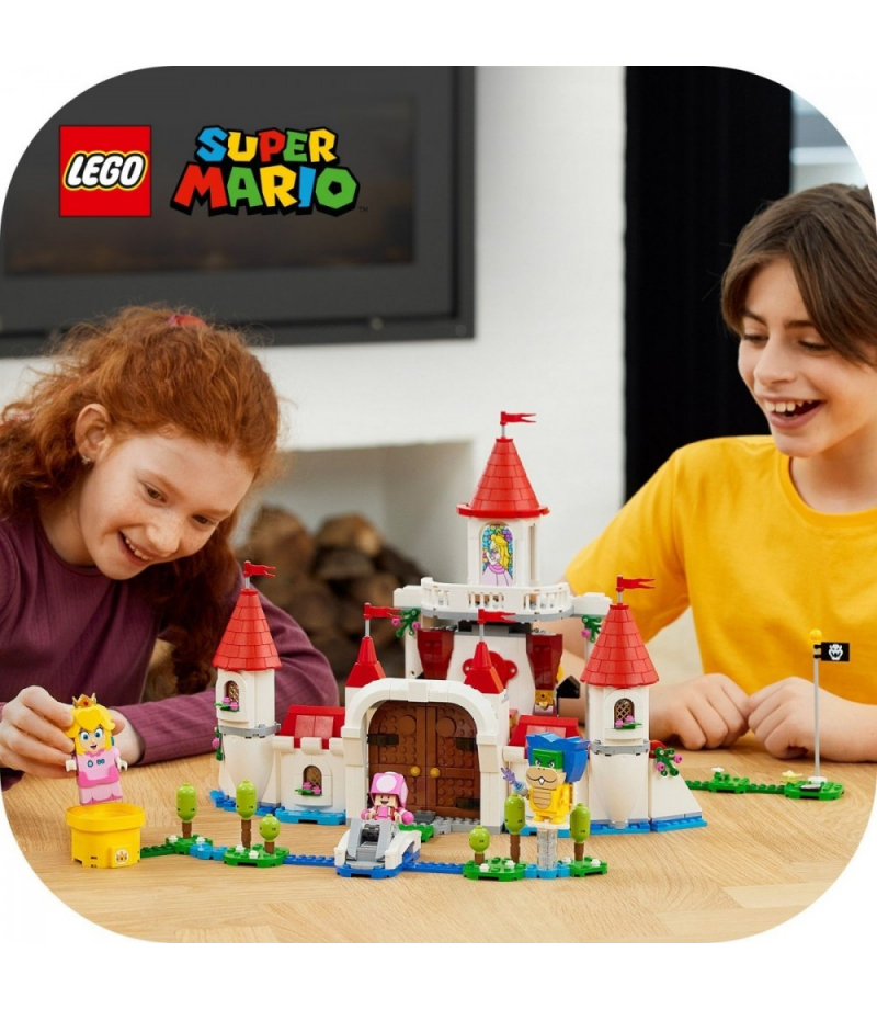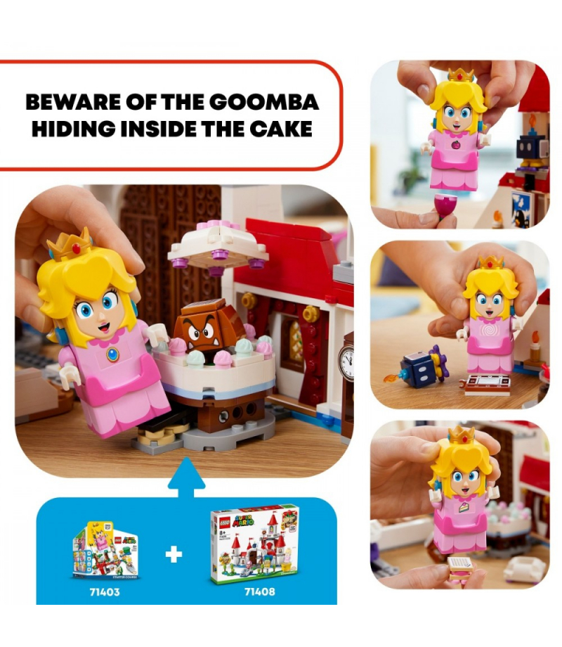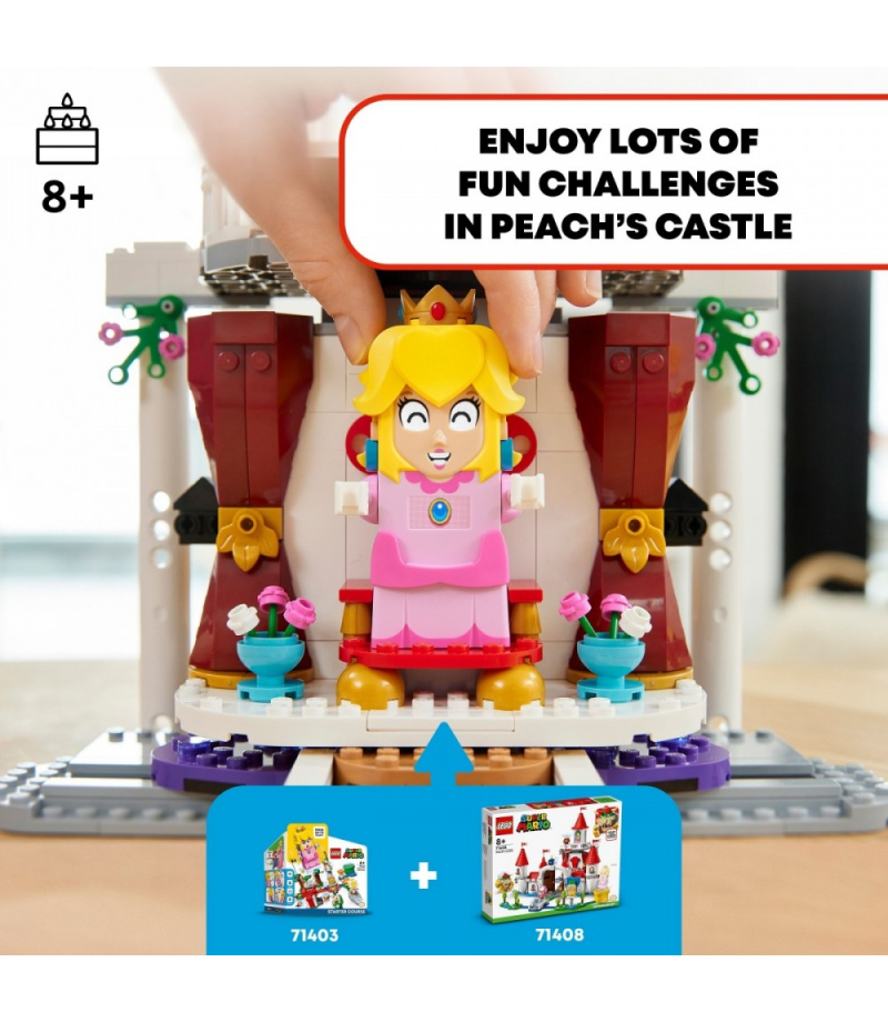 Zestaw Zamek Peach - zestaw rozszerzający (71408) pozwala dzieciom wzbogacić swój świat LEGO Super Mario o dobrze znany poziom. Razem z interaktywnymi figurkami LEGO Mario, LEGO Luigi lub LEGO Peach (figurki nie są częścią zestawu) gracze mogą zwiedzić nowe miejsce i zbierać cyfrowe monety na wiele sposobów. W zestawie są sala tronowa z obracającą się ścianą, za którą chowa się Bowser, witraż z wizerunkiem Peach, obraz ze znacznikiem akcji przedstawiający Bob-ombę, ciasto z Goombą w środku, specjalna rura zamku Peach, blok czasu, uszkodzony most, miska owoców z fioletowym owocem i nie tylko. (Uwaga: do interaktywnej zabawy wymagany jest zestaw startowy 71360, 71387 lub 71403).