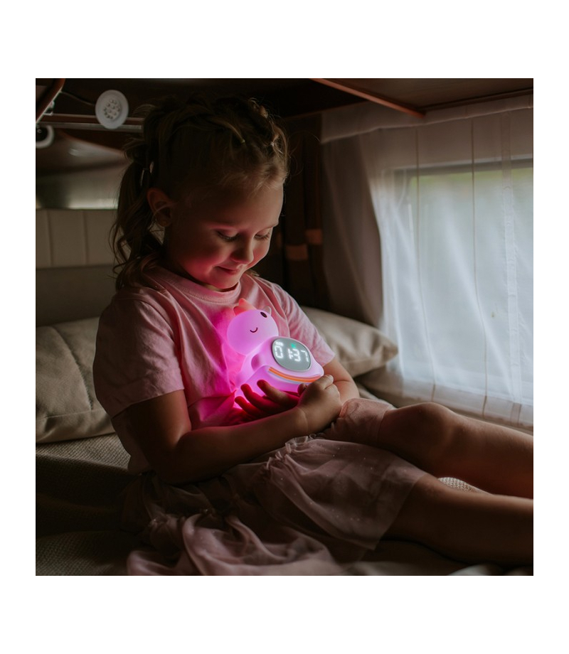 Łączy w sobie funkcję delikatnej lampki nocnej oraz praktycznego budzika, dzięki czemu świetnie sprawdzi się na szafce nocnej w sypialni lub pokoju dziecka.