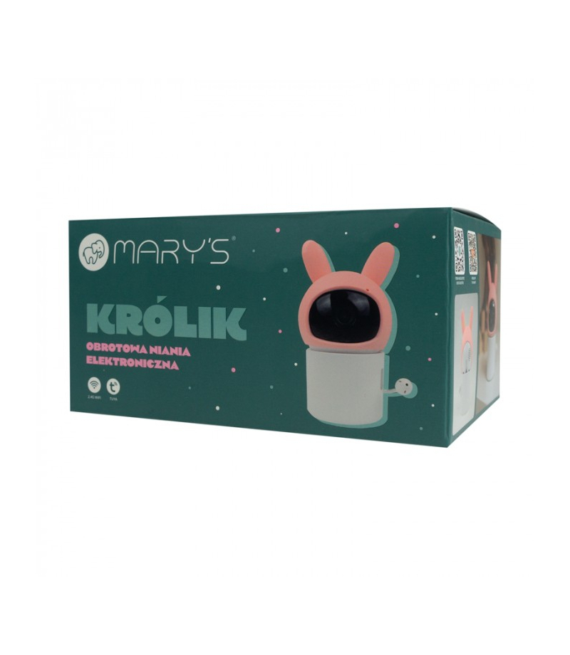 MARY`S Obrotowa niania kamera elektroniczna Królik różowy WiFi TUYA Eco Light MW61444 MARY’S Obrotowa niania elektroniczna „Królik” – różowy, HD Słodki wygląd różowego króliczka i mobilna kamera w jednym. Obrotowa niania pozwala wygodnie objąć wzrokiem cały pokój – z podglądem w HD , trybem nocnym i zapisem na kartę pamięci. Najważniejsze atuty Obrotowa głowica PTZ – sterowanie z aplikacji: poziomo 355° / pionowo 55° ; zobaczysz każdy kąt pokoju. Szeroki kąt obiektywu 120°...