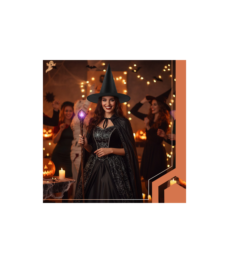 Klasyczny kapelusz czarownicy w głębokim czarnym kolorze to idealne uzupełnienie kostiumów wiedźmy, wróżki, maga czy postaci fantasy. Stożkowy kształt i szerokie rondo tworzą wyrazisty efekt, który przyciąga spojrzenia i nadaje stylizacji wyjątkowego charakteru. Kapelusz jest lekki, wygodny i uniwersalny. Doskonale sprawdzi się podczas Halloween, balów przebierańców, przedstawień, sesji zdjęciowych oraz imprez tematycznych.