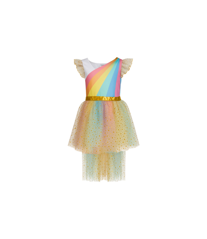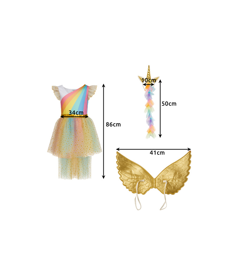 kompletny zestaw – sukienka, złote skrzydła i opaska z rogiem, nie musisz nic kompletować – wyjmujesz z opakowania i strój jest gotowy do zabawy lub wyjścia na bal