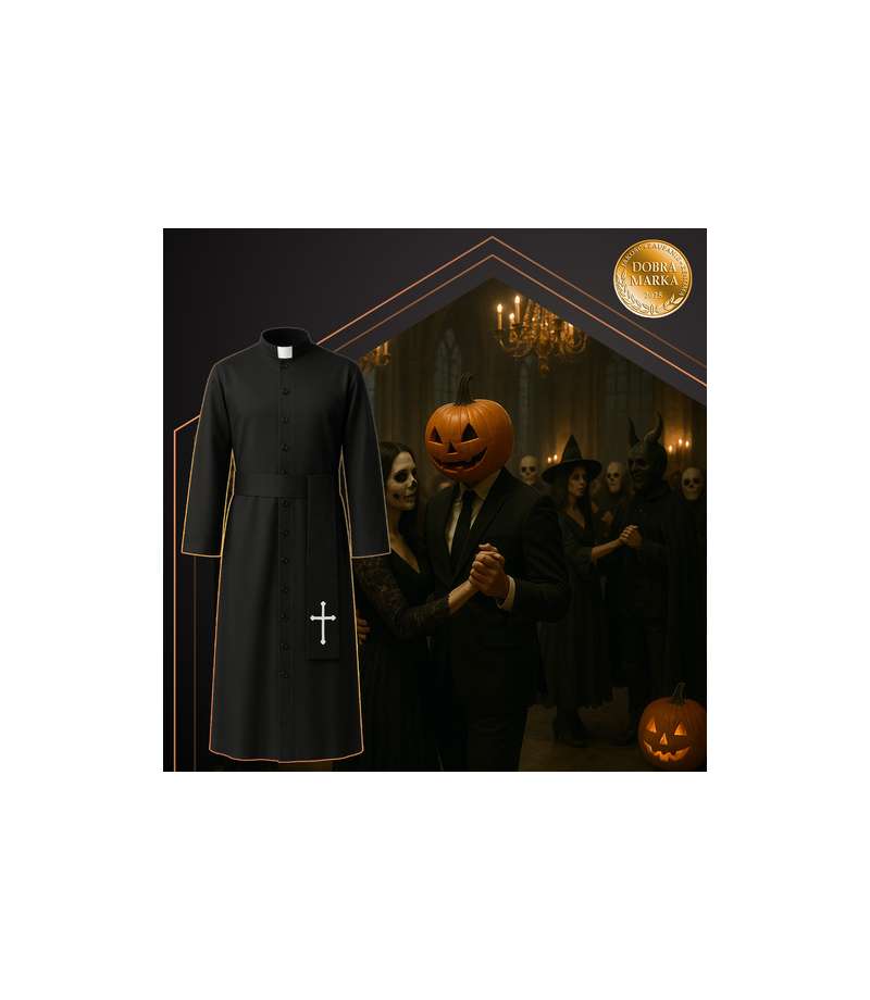 Klasyczny strój duchownego z czarną sutanną z koloratką oraz wiszący krzyż to gotowe przebranie, które świetnie sprawdzi się na Halloween, balu kostiumowym i przedstawieniu. Luźny krój i rozmiar XL/XXL zapewniają wygodę noszenia. Stylizacja przyciąga spojrzenia i nadaje charakter każdej imprezie.