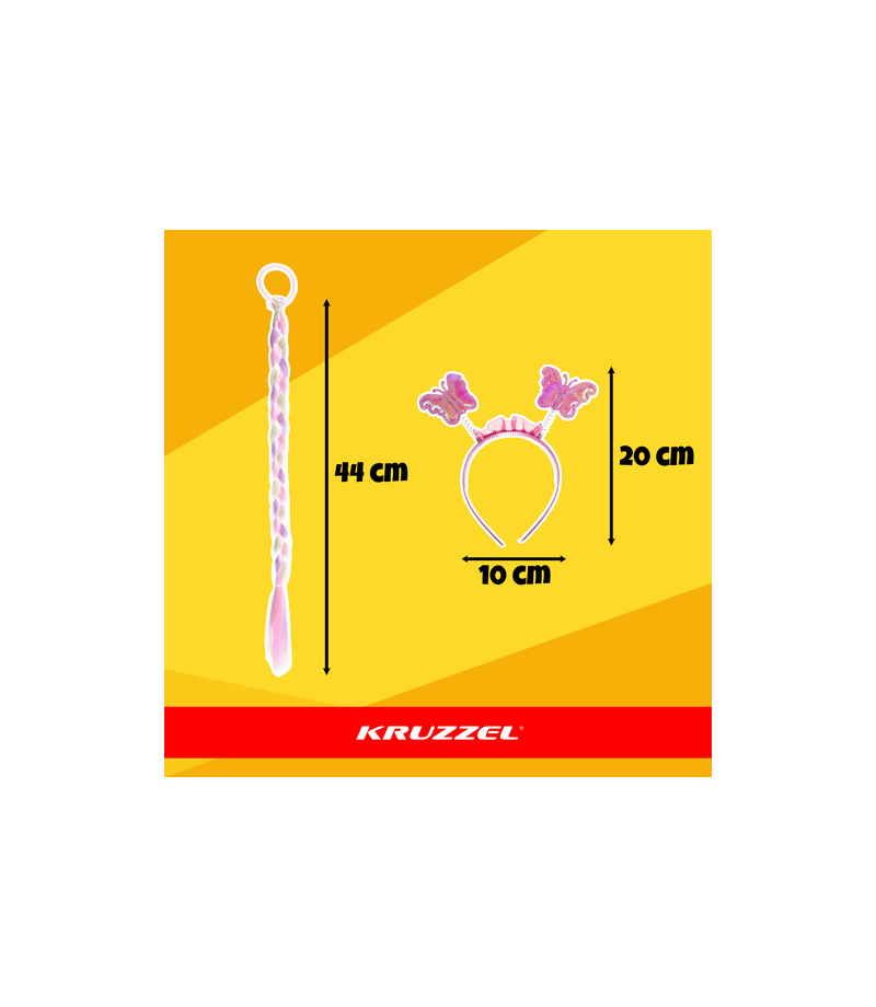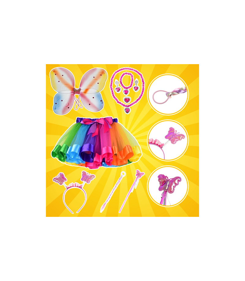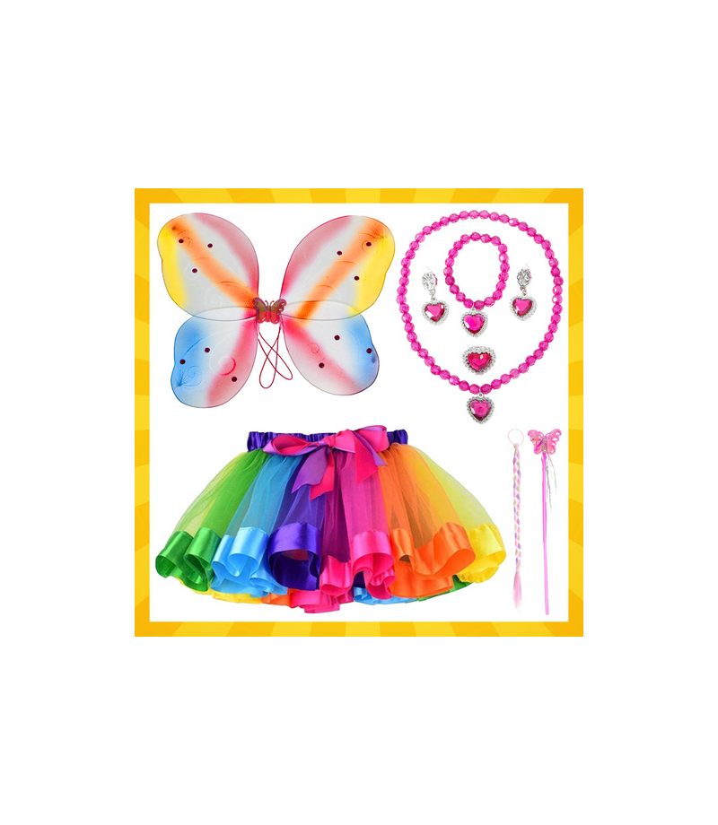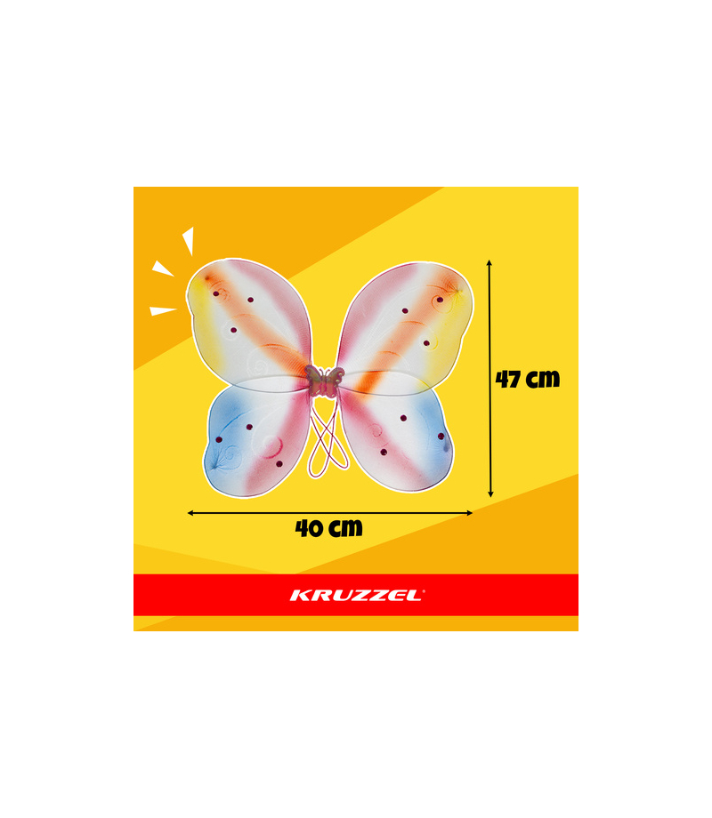 - kompletny zestaw – skrzydła, tęczowa spódniczka, opaska z czułkami, różdżka, włosy ombre i biżuteria, nie musisz nic kompletować – wyjmujesz z opakowania i strój jest gotowy do zabawy lub wyjścia na bal