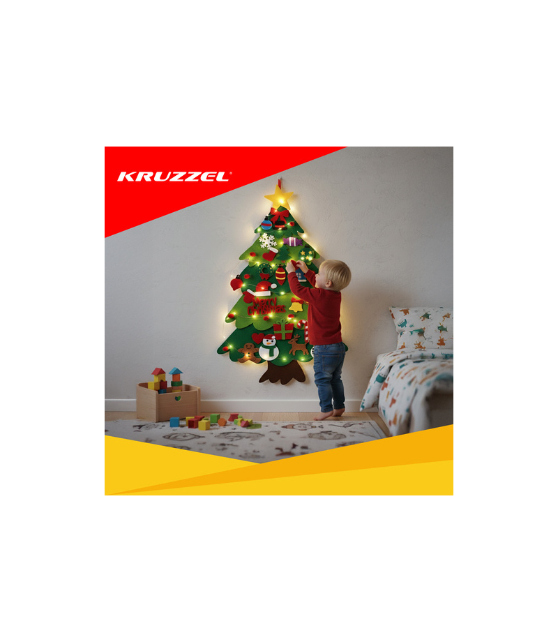 Filcowa choinka KRUZZEL – świąteczna mata dla dzieci z LED, ozdoby na rzepy, bezpieczna zabawka DIY wspierająca koordynację i kreatywność! Szukasz wyjątkowej dekoracji, która zachwyci dziecko i stanie się jego ulubioną świąteczną zabawkąFilcowa mata w kształcie choinki z łańcuchem LED i 26 ozdobami do dekoracji to połączenie magii świąt z nauką i kreatywną zabawą. Dziecko może samodzielnie przystrajać choinkę ulubionymi ozdobami – bałwankiem, prezentami, reniferem czy śnieżynkami – i zmieniać kompozycję, kiedy tylko zechce!