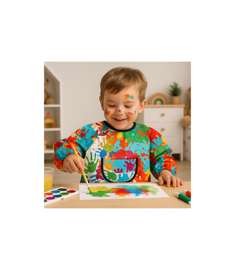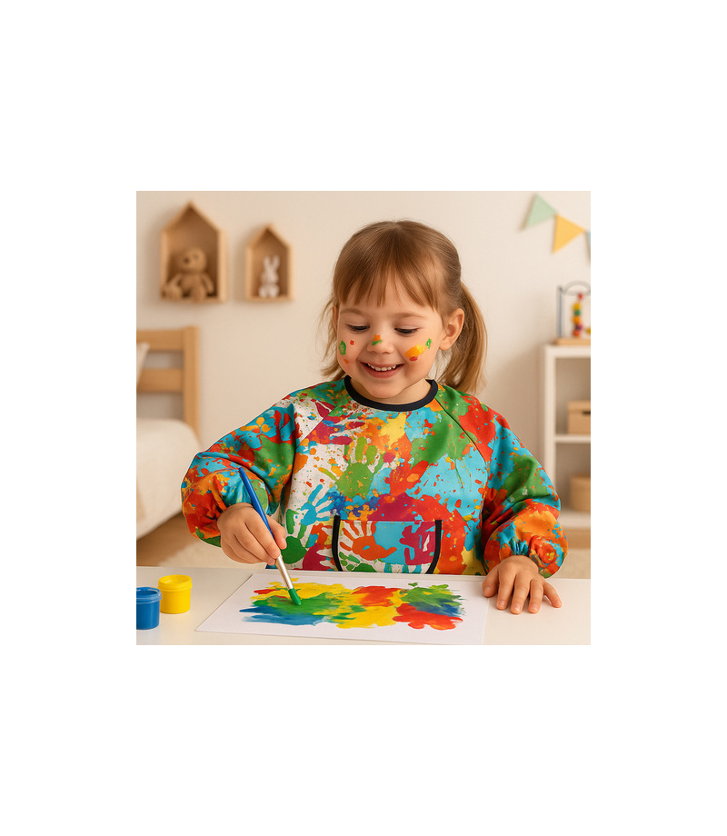 - skutecznie chroni ubrania - f artuch do malowania dla dzieci wykonany jest z wodoodpornego materiału, który zabezpiecza odzież przed farbą, klejem i tuszem , długie rękawy i luźny krój zapewniają pełne pokrycie – idealny na zajęcia w przedszkolu i domu