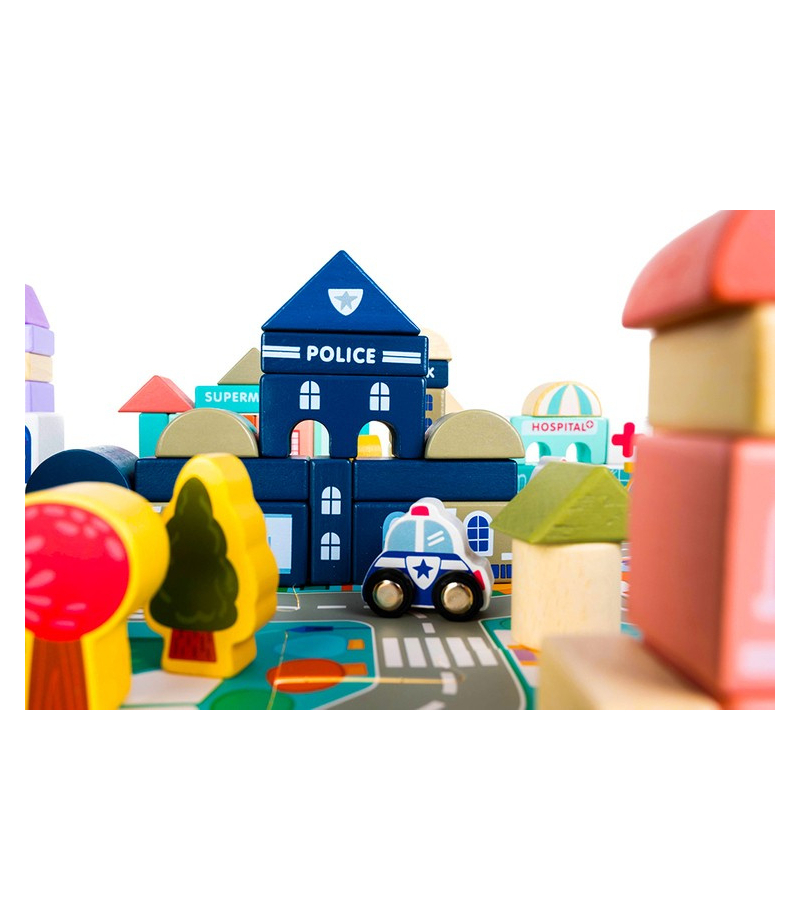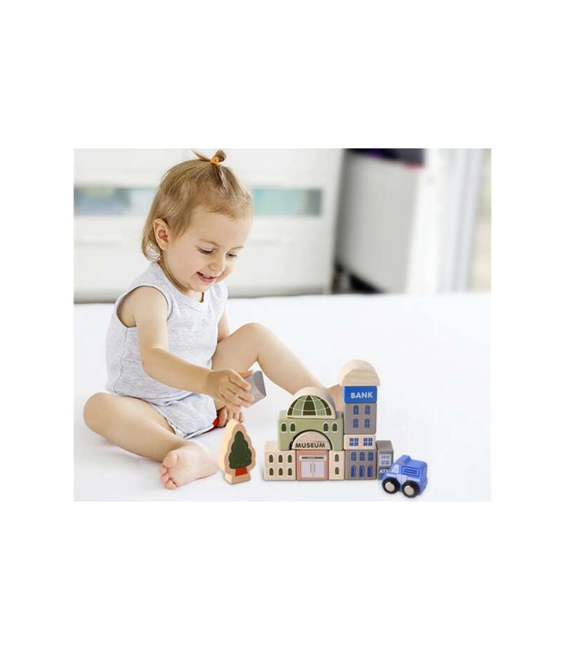 Zabawka, jaką są klocki drewniane miasto, to wiele godzin niesamowitej zabawy dla najmłodszych. Zestaw jest bardzo duży – w jego skład wchodzi aż 115 różnego rodzaju klocków i 20 szt. puzzli imitujących ulicę. Z klocków można układać różnego rodzaju budynki mieszkalne oraz budynki użyteczności publicznej, ponadto zestaw obejmuje również elementy takie jak drewniane pojazdy, znaki, latarnie, a nawet drzewka. Wszystko to sprawia, że edukacyjne klocki miasto to bardzo realistyczna zabawka, która zawsze wygrywa z nudą.