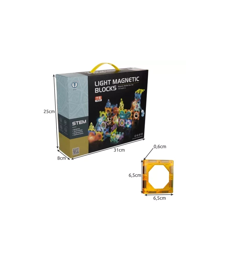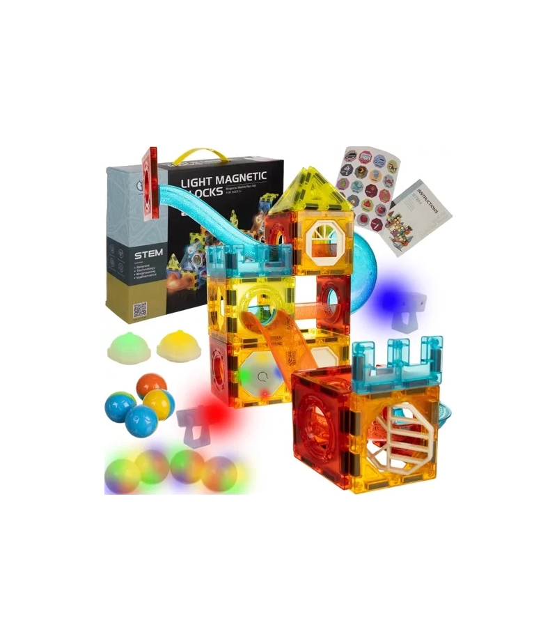 KLOCKI MAGNETYCZNE ŚWIECĄCE ELEMENTY – te magnetyczne klocki konstrukcyjne posiadają w zestawie podświetlane kolorowe kulki i świecące jasnym światłem reflektorki urozmaicające zabawę tworząc efekt świecącego toru. DUŻY ZESTAW – klocki edukacyjne w dużym zestawie to wiele godzin kreatywnej zabawy i mnóstwo możliwości stawiania różnorodnych konstrukcji. Elementy mają różne kształty i kolory, co daje nieograniczone pole dla dziecięcej wyobraźni. W zestawie znajdują się płaskie...