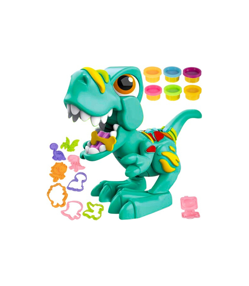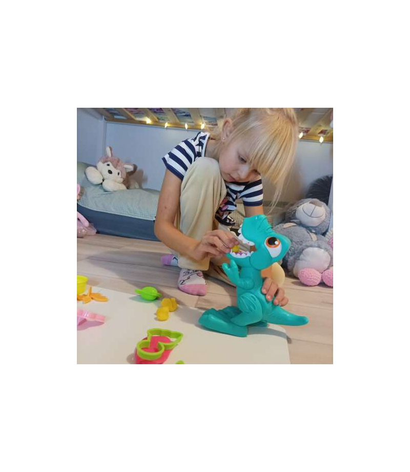DINOZAUR KTÓRY JE I ZNOSI JAJKA + ZESTAW MAS PLASTYCZNYCH + FOREMKI RUCHOMY DINOZAUR, KTÓRY JE I ZNOSI JAJKA - dinozaur jest bardzo kreatywnym rozwiązaniem na zabawę. Jego ręce i nogi są ruchome, można je ustawić w różniej pozycji , a paszcza i brzuch otwierają się . Dzięki temu dziecko może nakarmić dinozaura. Dodatkowo nad ogonkiem ukryty został przycisk, który otwiera dolny schowek, a dinozaur wypróżnia się. Dinozaur może również znosić jajka zrobione przez dziecko....