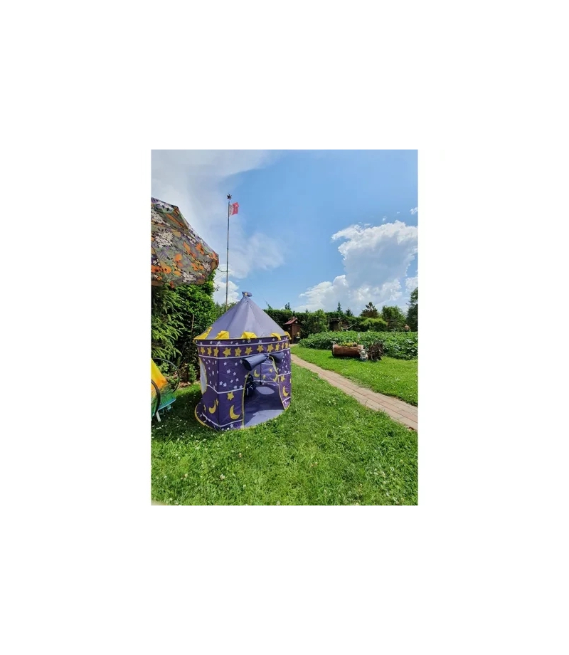 Namiot dla dzieci to wyśmienita zabawa przez długie godziny. Materiałowy domek dla dzieci w kształcie czarodziejskiego zamku to wymarzony prezent dla każdego dziecka. Pałac dla dzieci posiada dwa okienka z drobnej siateczki oraz odpinane na rzepy wejście. Można się w nim schować z ulubionymi zabawkami i puścić wodze fantazji. Namiot dla dzieci będzie idealnym miejscem do pełnej emocji i wyobraźni zabawy zarówno w domu, jak i na świeżym powietrzu – np. w ogrodzie, na pikniku, na tarasie czy na plaży.