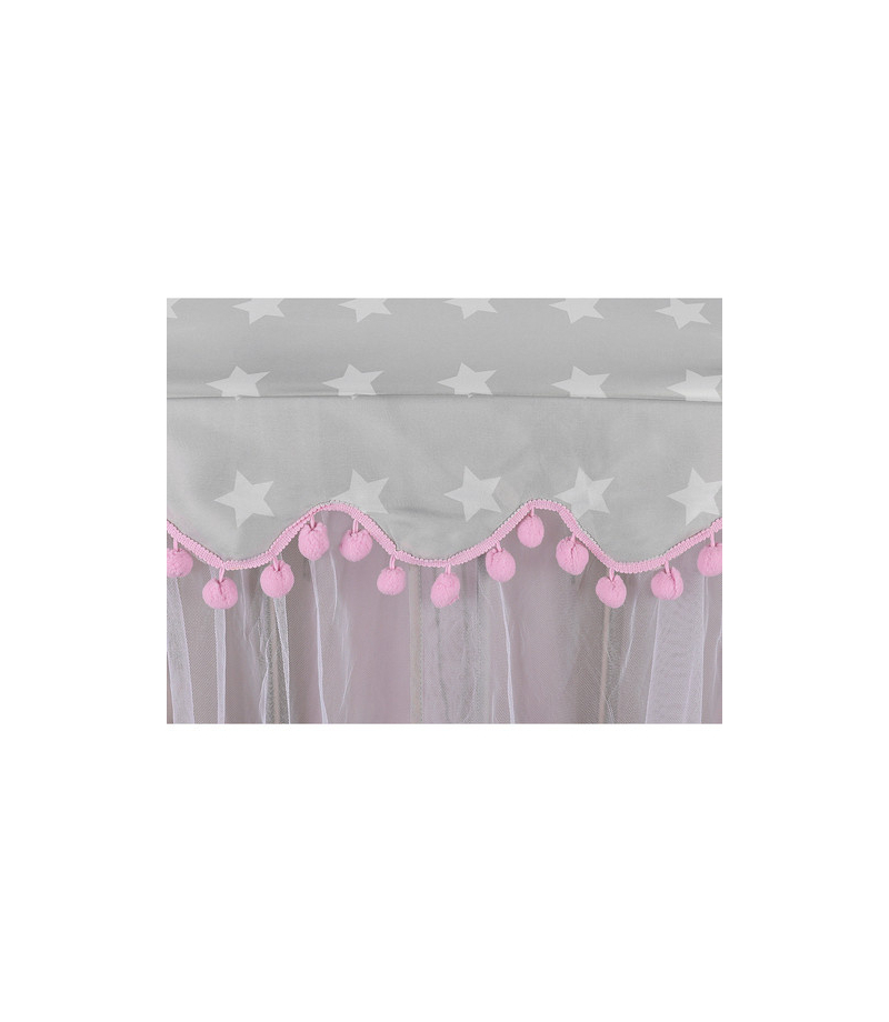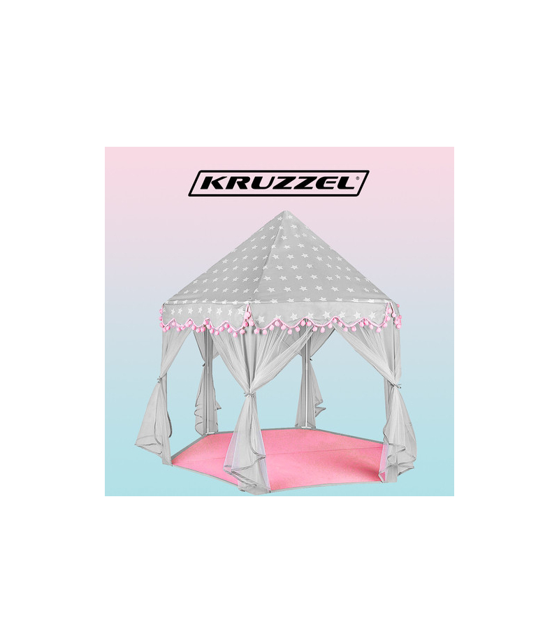 Namiot dla dzieci to wspaniały sposób na kreatywną i fantazyjną zabawę w domu, jak i poza nim. Pobudza wyobraźnię i pozwala na radosne spędzenie czasu samemu lub w większym gronie, bez ograniczenia wiekowego. Materiałowy zamek zdecydowanie jest niezastąpionym kompanem podczas dziecięcych figli. Ma podstawę sześciokąta, posiada 6 otworów wejściowych i stożkowy daszek. Wejścia są zasłonięte półprzezroczystymi, białymi firankami, które doskonale komponują się z pozostałą częścią namiotu. Gardinki można przewiązać bądź udrapować na różne sposoby przy pomocy ozdobnych tasiemek Zastosowane rozwiązanie wraz z kokardkami dodaje uroku, a także urozmaica zabawę.