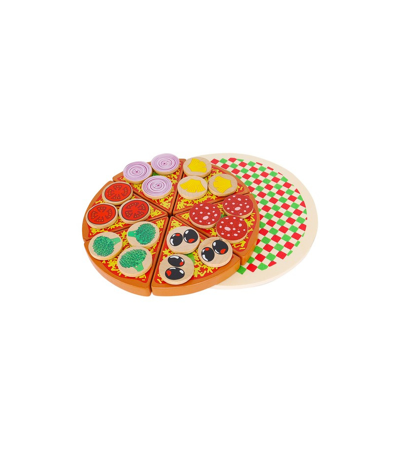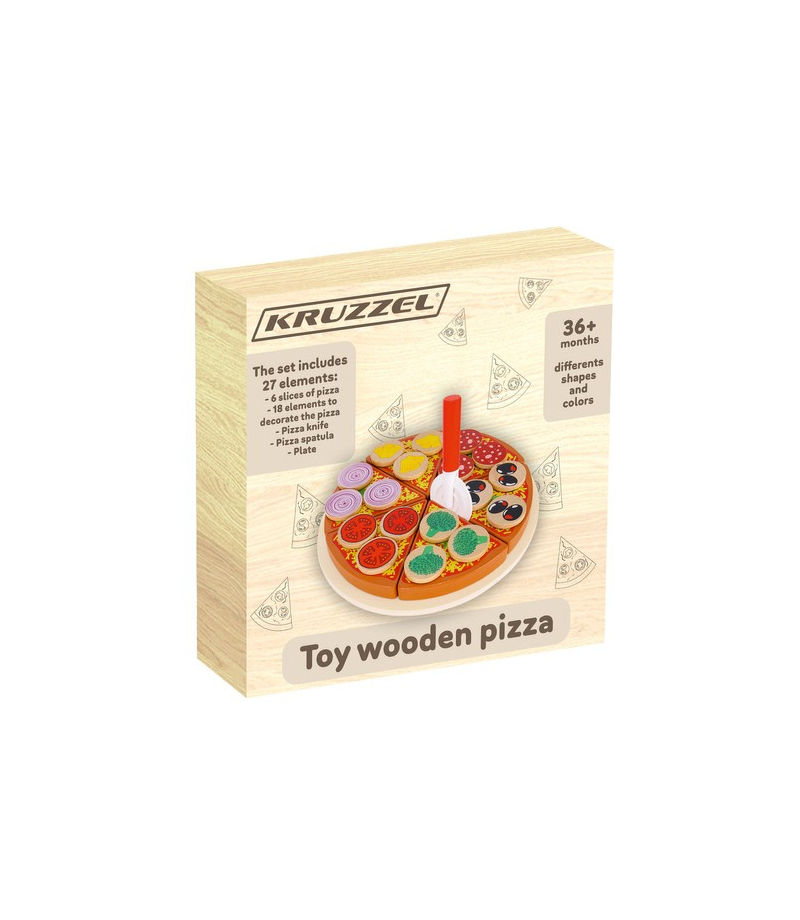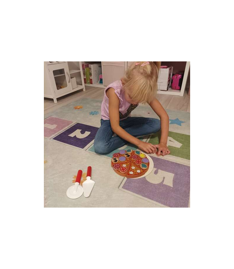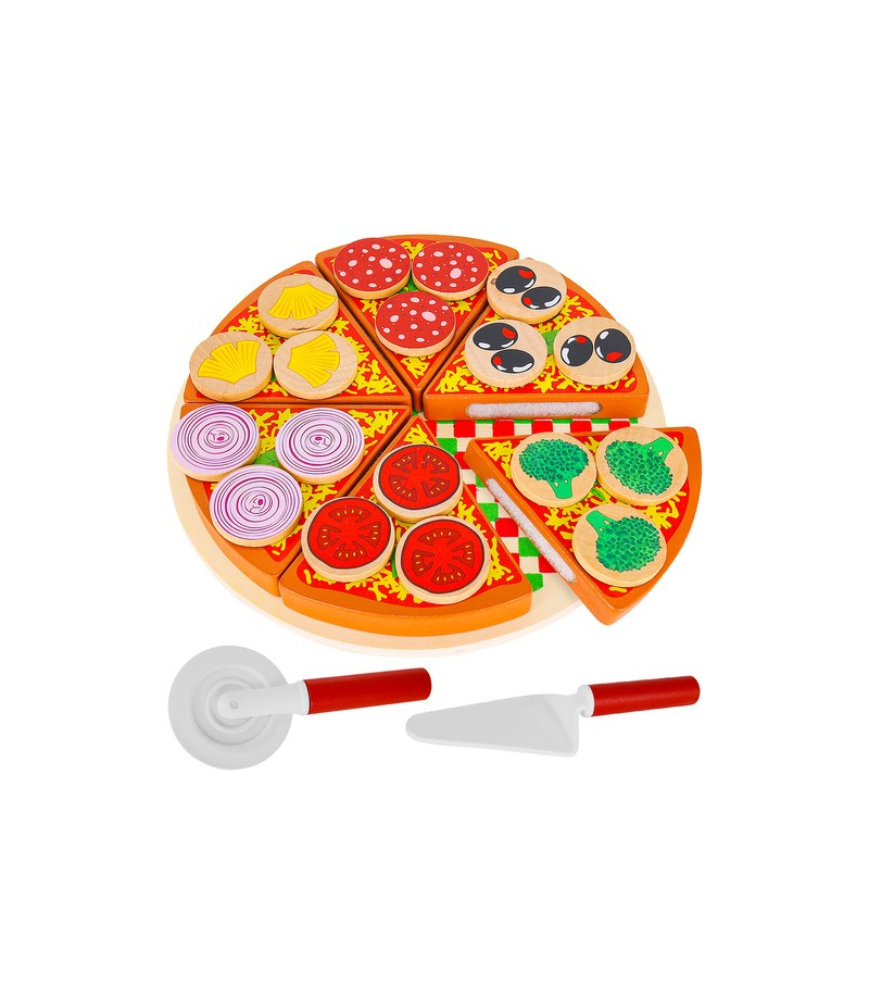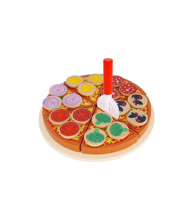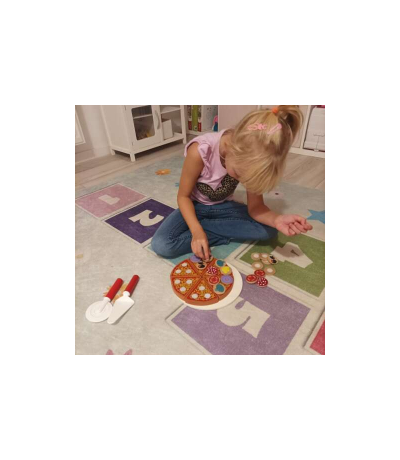 Kawałki pizzy oraz jej dodatki zostały połączone rzepami, dzięki czemu można je „kroić” a warzywa nie spadną podczas serwowania dania. Pizza będzie fantastycznym dodatkiem do drewnianej kuchni, która również znajduje się w naszej ofercie. Zabawka będzie odpowiednia zarówno dla chłopców, jak i dla dziewczynek. Piękne, żywe kolory przyciągają wzrok najmłodszych, pobudzają wyobraźnię i zachęcają do wesołej zabawy. W bardzo przemyślany sposób rozwija ona zdolności manualne dzieci, pomaga ćwiczyć koordynację ruchową i rozwija zdolność logicznego myślenia.
