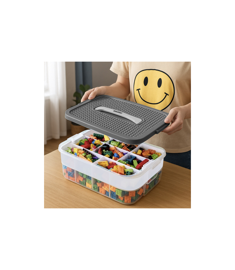 piętra nie rozłączą się podczas przenoszenia – każdy poziom organizera posiada mocne zatrzaski, które trzymają wszystko na miejscu, nawet przy intensywnym użytkowaniu pudełko na klocki 35l zachowuje pełną stabilność – bez niekontrolowanego rozpadania się